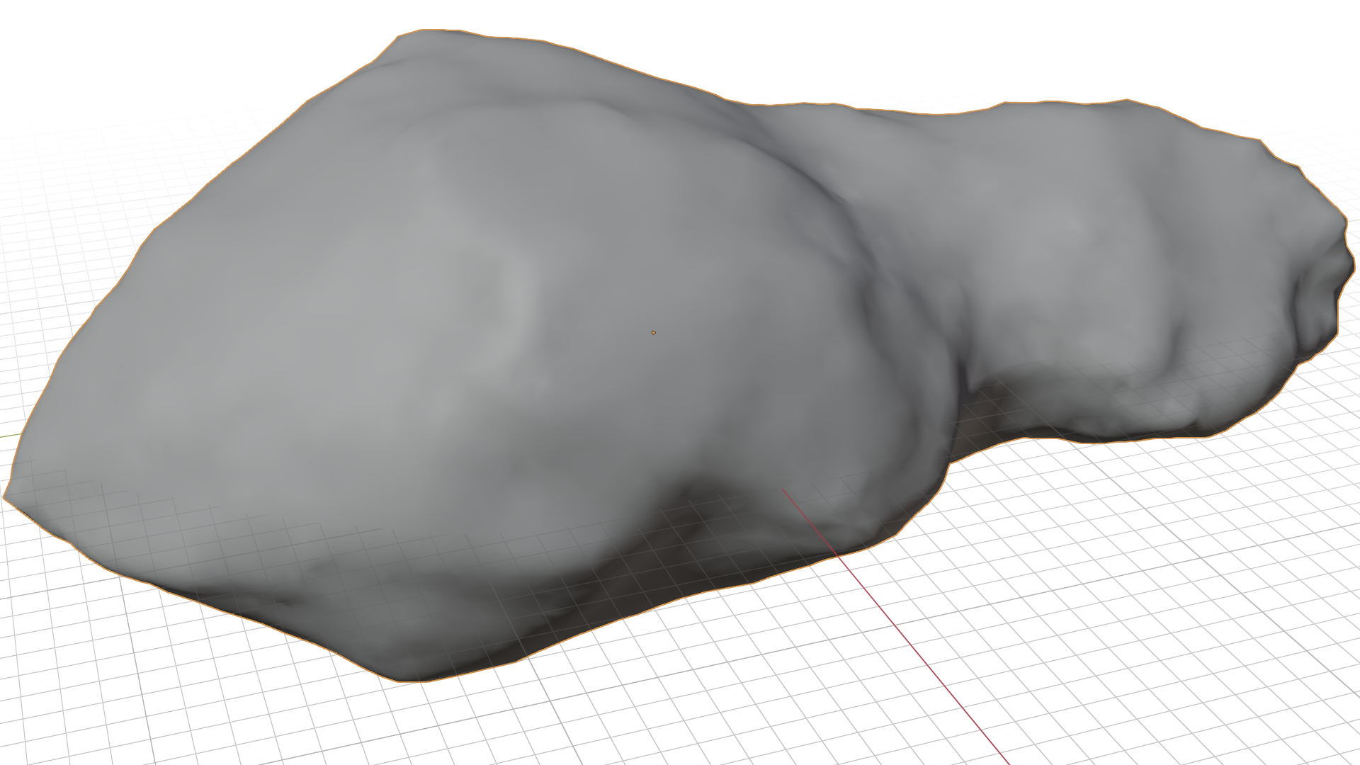 The radar data images of asteroid Toutatis indicate that it is an elongated, irregularly shaped object with ridges and perhaps craters. Along with shape detail, scientists are also seeing some interesting bright glints that could be surface boulders. Toutatis has a very slow, tumbling rotational state. The asteroid rotates about its long axis every 5.4 days and precesses (changes the orientation of its rotational axis) like a wobbling, badly thrown football, every 7.4 days.