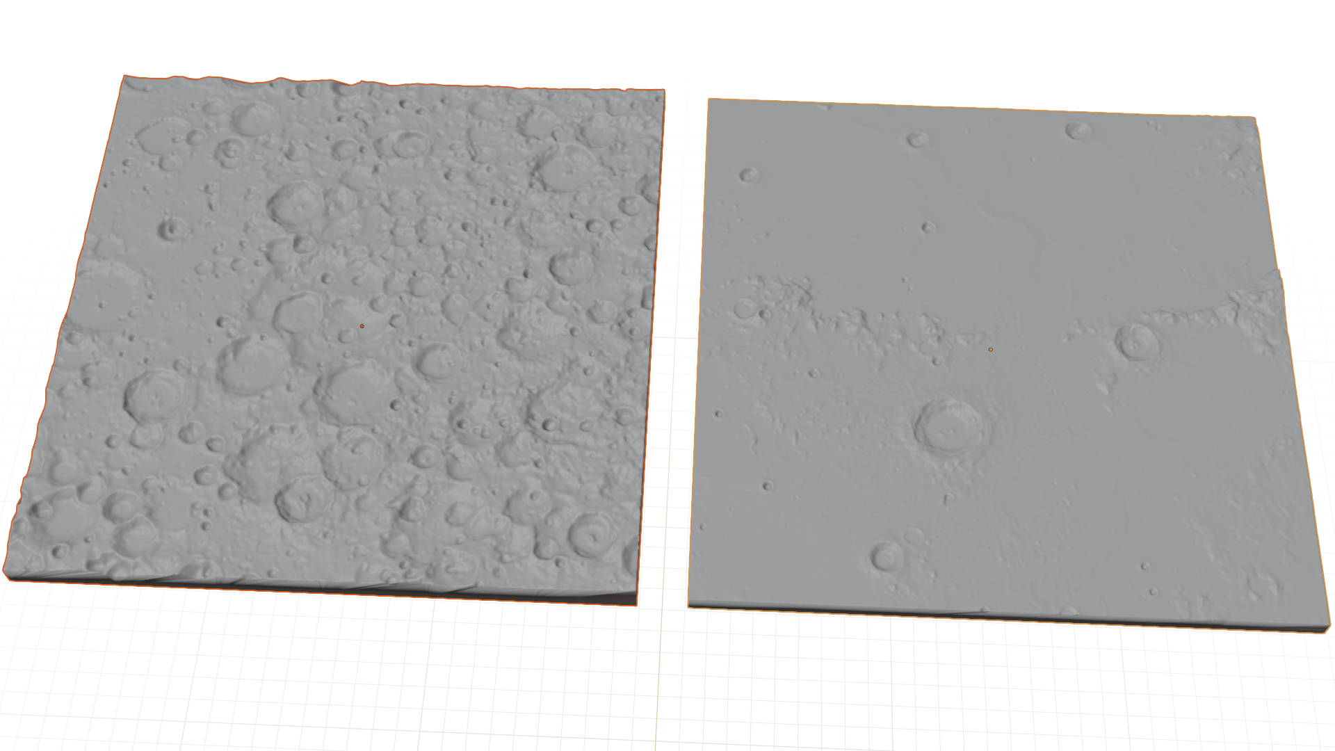 These two printable STL files demonstrate the differences between the near and far side of Earth's Moon. The near side is smoother due to large lava flows that filled in many craters billions of years ago. Printed at their default size (8cm across) these models cover an area approximately 400km on a side at a scale of 5 million to one (1 cm = 50 km).