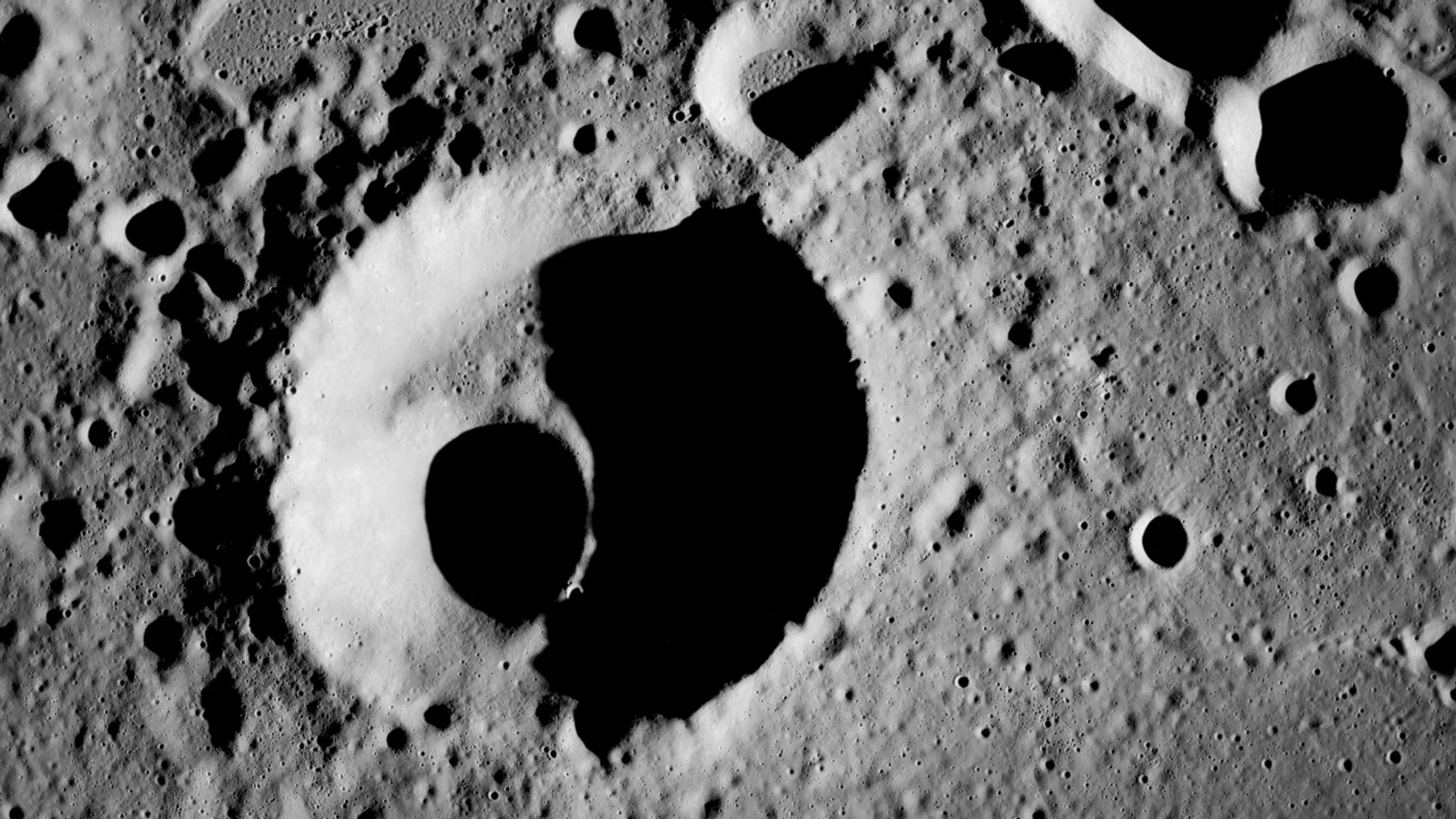 AS08-12-2052 (December 1968). This near-vertical photograph from the Apollo 8 spacecraft covers an area of approximately 50 by 50 statute miles within a 250-statute-miles-in-diameter crater on the lunar farside. The center of this large crater is located at about 157 degrees west longitude and 4 degrees south latitude. The large crater in the center of the picture is about 20 statute miles in diameter.