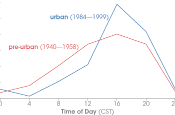 In a related study, Burian and Shepherd also used historical rain gauge data to confirm that the percent occurrence of rainfall around Houston had increased in post-urban Houston as compared to pre-urbanized Houston. Burian and Shepherd also revealed that the city of Houston may have shifted the time of likely occurrence of storms until later in the afternoon.