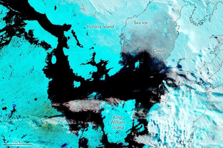 Though summer has long since passed and Arctic waters should be starting to freeze, a break in the clouds in October 2021 suggested that not everything in the far north is ready to hibernate. In the late morning on October 14, the Moderate Resolution Imaging Spectroradiometer (MODIS) on NASA’s Terra satellite acquired these natural- and false-color images of Victoria Island and King William Island in Canada’s Nunavut Territory. The false-color combination of visible light and infrared (bands 7-2-1) helps distinguish ice (cyan) from clouds (gray and white).