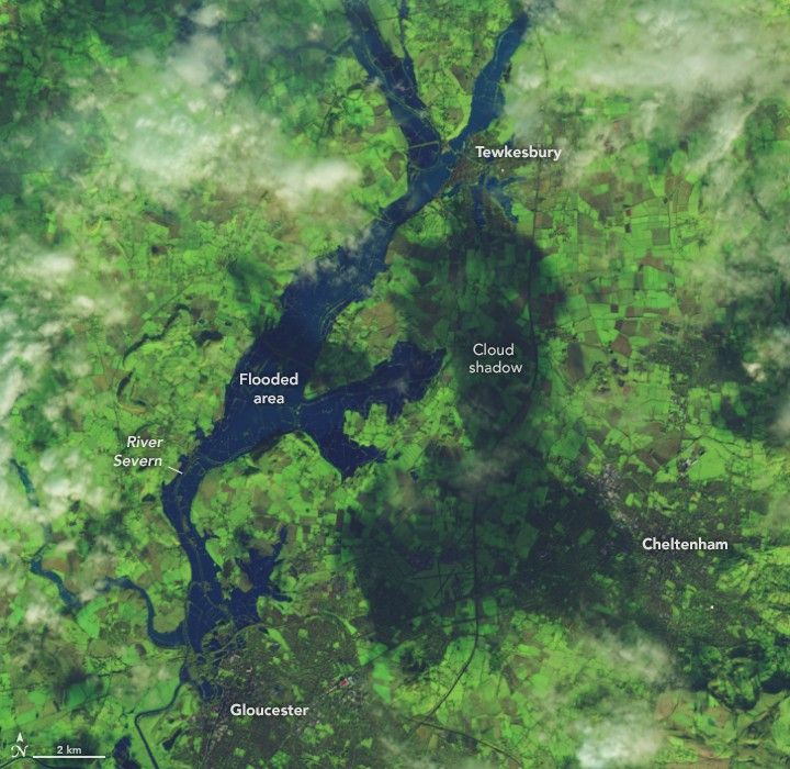 England’s Midlands were some of the worst-hit by the storm, including along the River Severn. The image above (right) shows water overtopping the banks of the Severn near Gloucester on January 3. Hundreds of properties located near the Severn in the West Midlands flooded during the storm, according to news reports. For comparison, the image on the left shows the same area on January 30, 2019. Both images were acquired by the OLI (Operational Land Imager) on Landsat 8 and are false color to emphasize the presence of water, which appears in shades of blue.