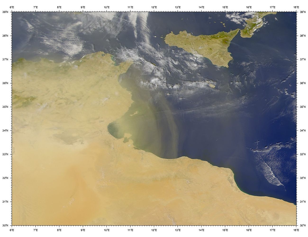 On October 6, 2001, the Sea-viewing Wide Field-of-view Sensor (SeaWiFS) captured this true-color image of a large dust storm blowing northeastward across the Mediterranean Sea from Tunisia. According to Joseph Prospero, professor of atmospheric science at the University of Miami, there is an unusual arc-shaped “front” to the dust cloud. The storm’s shape suggests that the source of the dust is rather small and that the meteorology driving it rather unusual. The dust seems to be coming out of the wadis, dry lakebeds and riverbeds, at the base of the Tell Atlas Mountains in northern Tunisia and eastern Algeria.