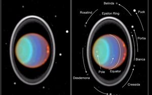 The Voyager 2 spacecraft visited the Uranian system in 1986 and found 10 moons, just 16-96 miles (26-154 km) in diameter: Juliet, Puck, Cordelia, Ophelia, Bianca, Desdemona, Portia, Rosalind, Cressida, and Belinda.