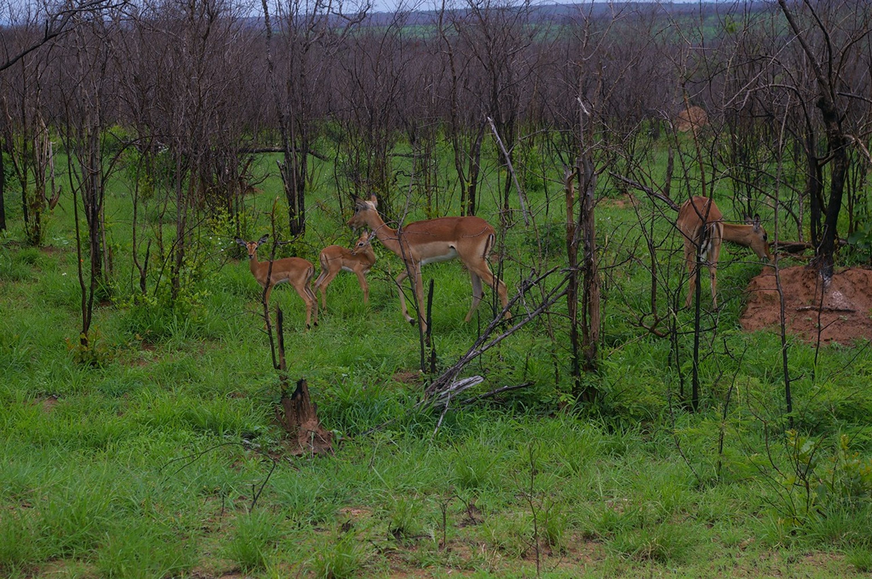 The view from the ground is even more revealing. The fire killed the top of trees taller than three meters (10 feet), says Govender, but the grass came back entirely. Like the grass, the trees began to regrow, but for now they are small and tender enough for animals to eat. This photo, taken by Govender, shows impalas grazing on the new grass and young trees beneath fire-blackened trees. To completely remove the woody vegetation and restore open grassland, managers will set a second high-intensity fire after the grass and shrubs regrow enough to sustain the fire, says Govender.