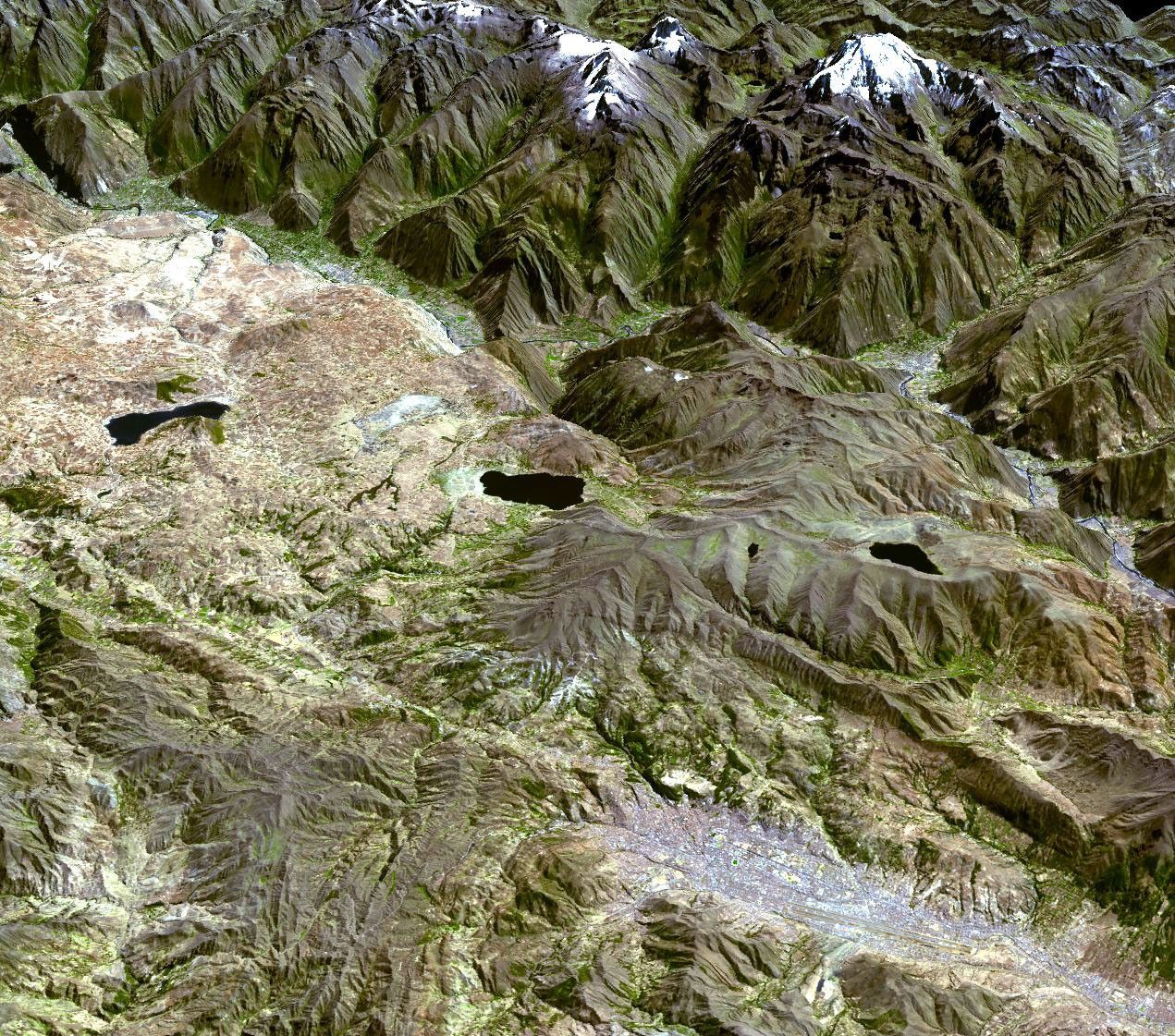 This topographic image from the Advanced Spaceborne Thermal Emission and Reflection Radiometer (ASTER) on NASA’s Terra satellite from July 18, 2006, shows Cuzco, Peru, which was once the capital of the Inca Empire. Cuzco sits in a valley in the foreground (near the bottom edge), with the snow-capped Andes in the background. The river running through the top of the image passes through the region known to the Inca as the Sacred Valley. As in the time of the Inca, the valley is fertile agricultural land, and growing vegetation lines the river, making a sharp contrast to the more arid slopes of the high mountains, which appear thinly covered with vegetation. The Sacsayhuaman ruins, which may have been a fortress, stand guard over Cuzco from a rock outcrop at the northwestern end of the city. A small but distinct green dot in the heart of the city is a conspicuous sign of the modern age: the dot is the Garcilaso de la Vega football (soccer) stadium.