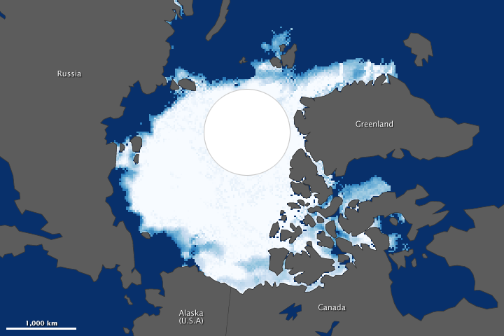 The 1984 image was made from observations by the Scanning Multichannel Microwave Radiometer (SMMR) on the Nimbus-7 satellite. Sea ice in the 1984 image has a blockier appearance because that sensor had coarser resolution. The white circle over the pole in each image is a data gap resulting from satellites flying close to—but not directly over—the poles. The wider orbital coverage by AMSR-2 (and other satellite instruments) has shrunk the size of this gap. The area around the North Pole is ice-covered—an assumption confirmed by many airborne and ice-surface expeditions—but researchers use an average of the concentration just outside the gap to estimate the extent within.