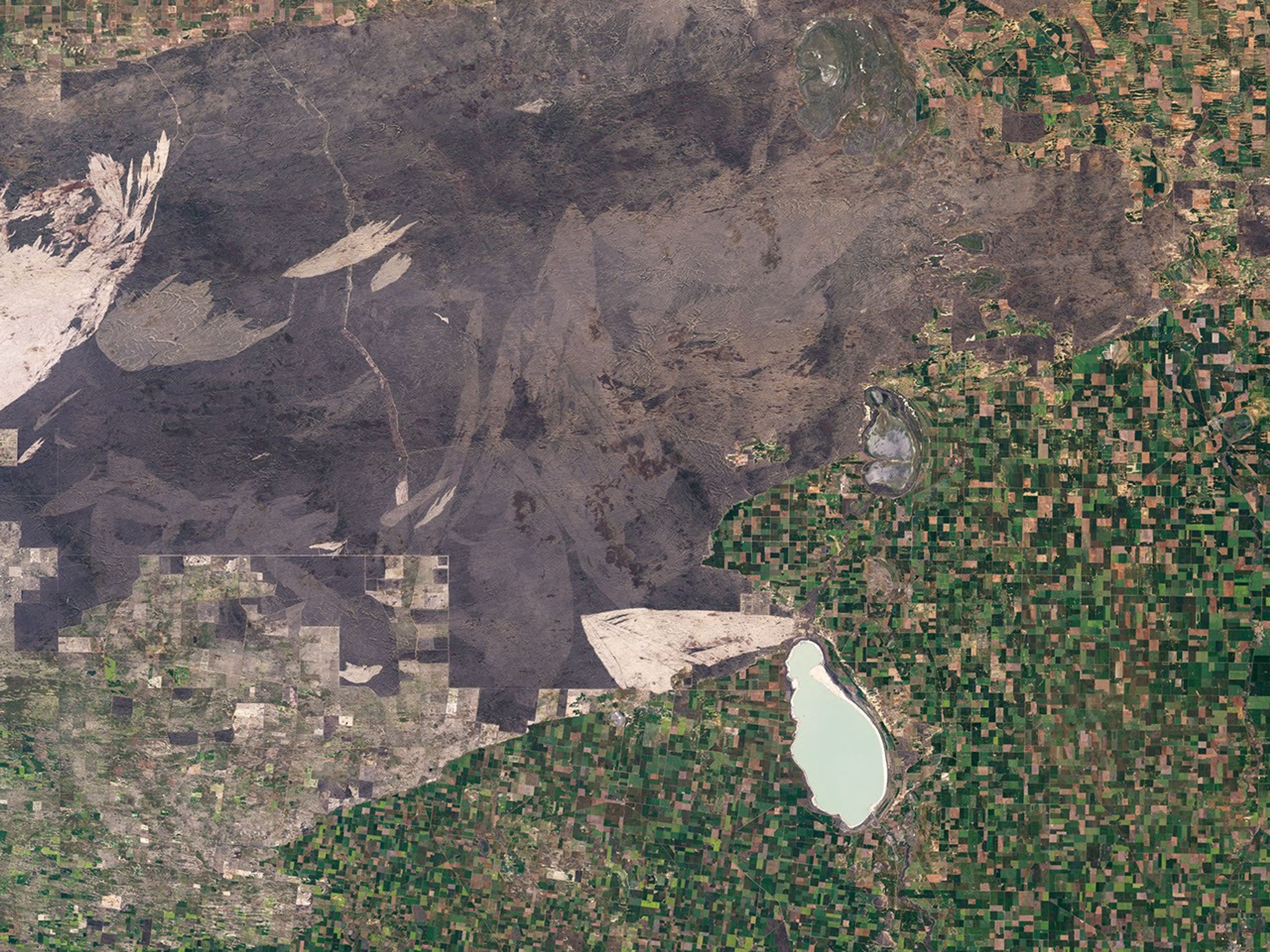 The Enhanced Thematic Mapper Plus on NASA’s Landsat 7 satellite captured this image of part of Wyperfeld National Park on October 1, 1999, in the middle of Australia’s spring growing season. The drought-tolerant, natural vegetation of the park is gray-brown, and it contrasts markedly with the tan and green rectangles of surrounding farmland. Within the park, fires have left prominent burn scars. In this image, more recent burn scars look like off-white sand. The largest scar appears along the left edge of the image. Next to it is an older, darker scar, where vegetation has begun to recover. Another recent, sizable scar appears northwest of Lake Hindmarsh.