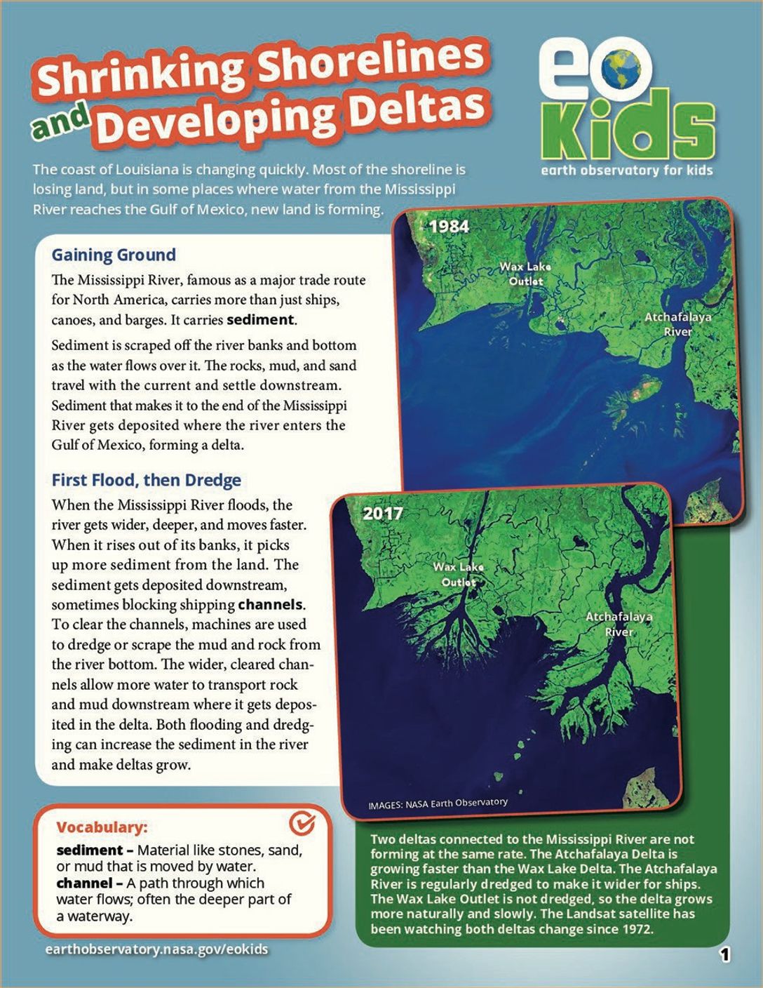 EO Kids is exploring the muddy waters of the Mississippi Delta. Follow the sediment as it travels down the river and discover how satellites help us find where the shoreline is shrinking and where it is gaining new ground. Plus, think like a scientist and see if you can solve the mystery of the disappearing delta wetland in this issue’s activity.