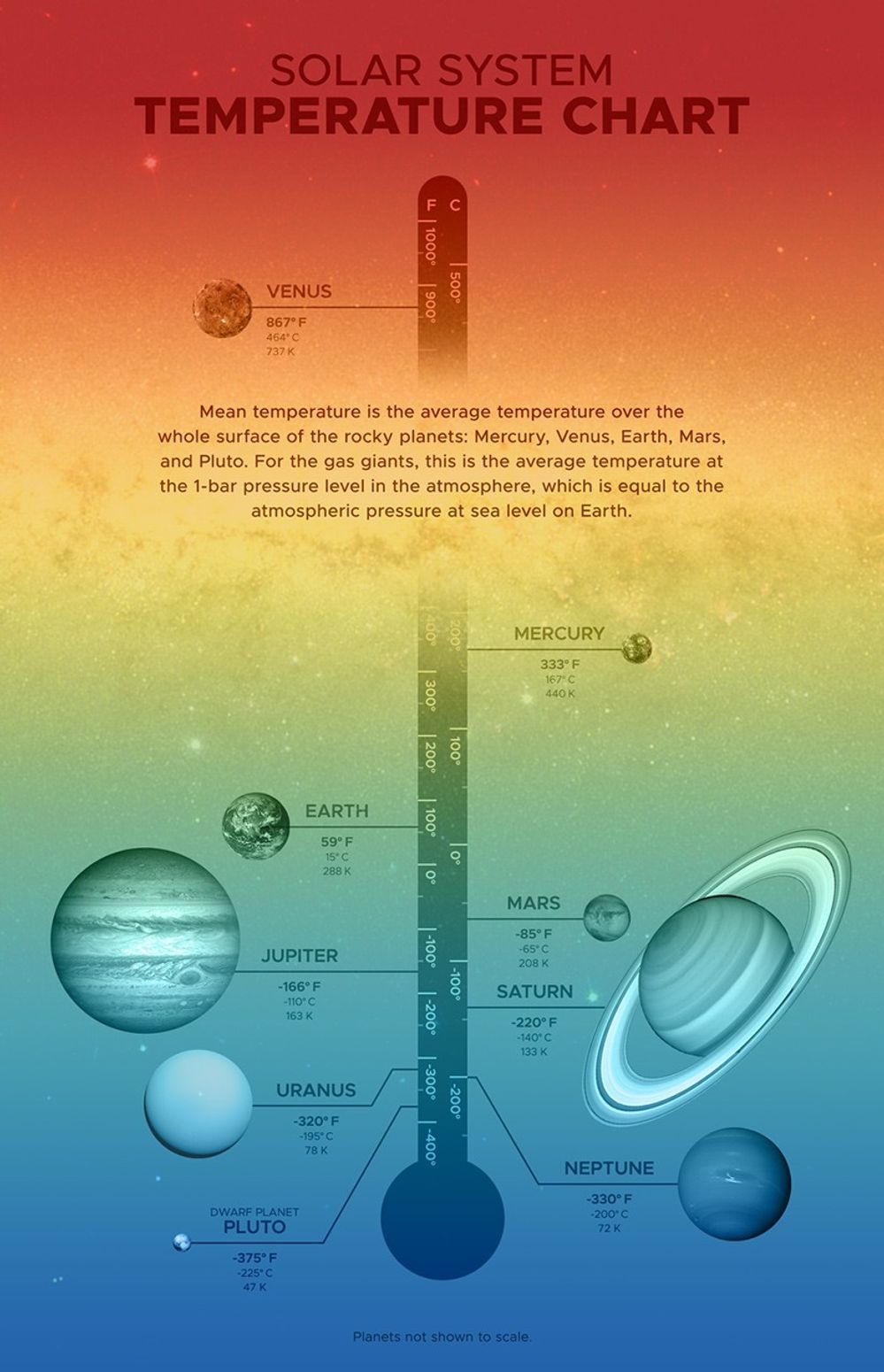 This graphic shows the mean temperatures of various destinations in our solar system. (Planets not to scale.)