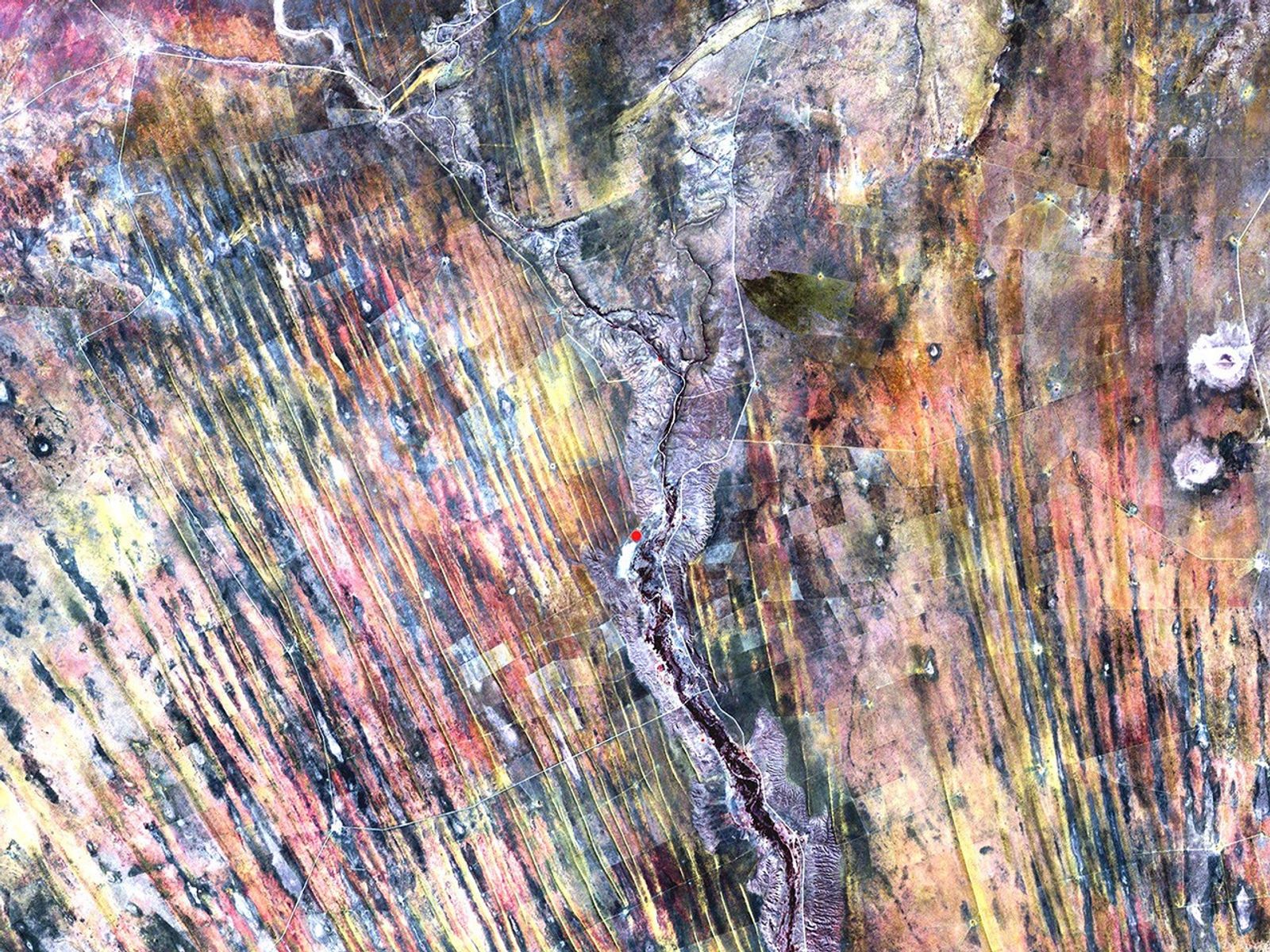 On the edge of the Kalahari Desert in Namibia, sand dunes are encroaching onto once-fertile lands in the north. Healthy vegetation appears red in this image; in the center, notice the lone red dot. It is the result of a center-pivot irrigation system, evidence that at least one optimistic farmer continues to work the fields despite the approaching sand.