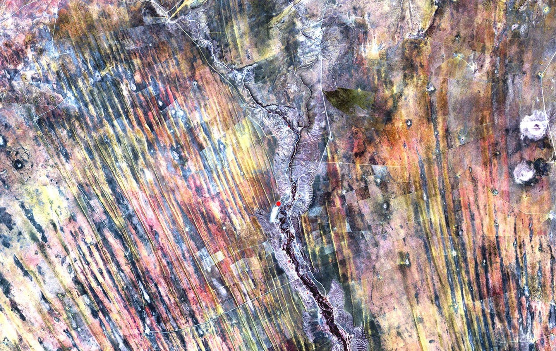 | Credit | Image provided by the U.S. Geological Survey (USGS) EROS Data Center Satellite Systems Branch. Caption adapted from text provided by NASA's Earth Observatory. Source: NASA/USGS Landsat 7; NASA Earth Observatory. |