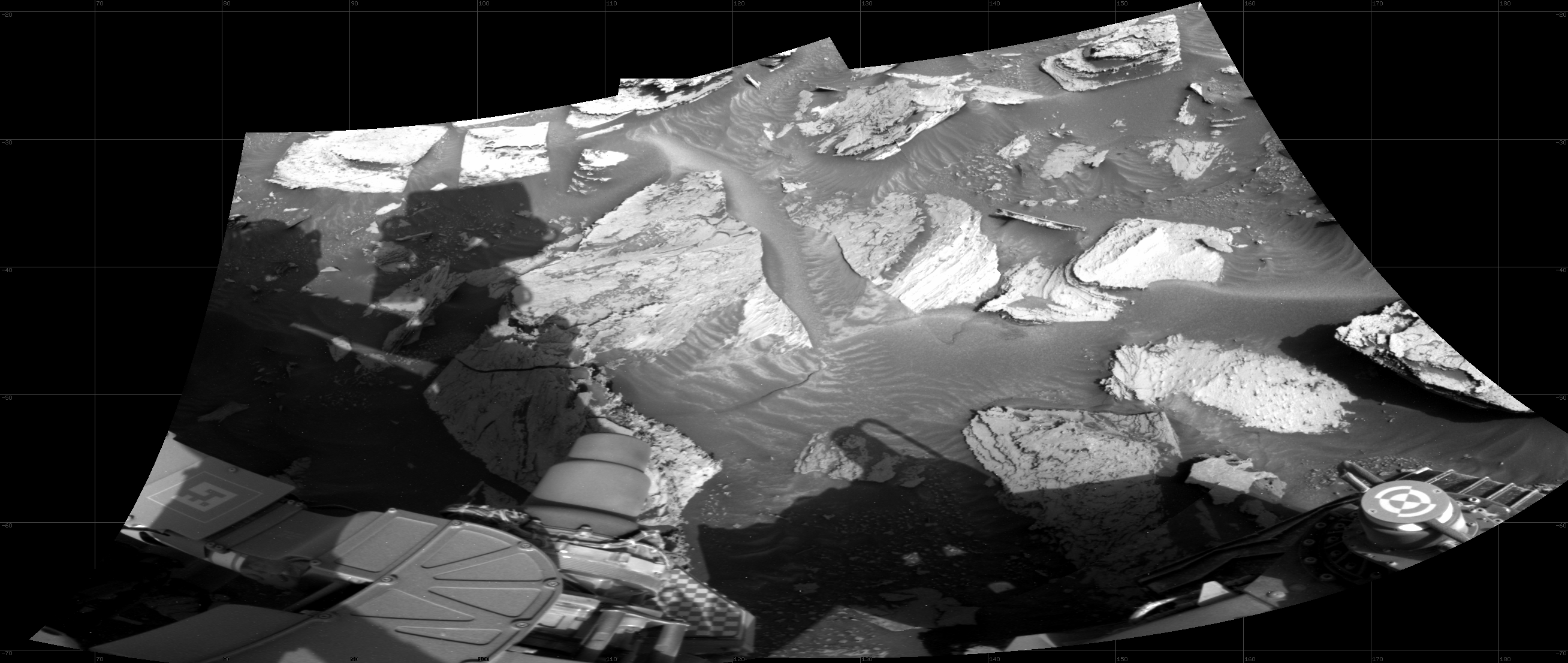 NASA's Mars rover Curiosity took 2 images in Gale Crater using its mast-mounted Right Navigation Camera (Navcam) to create this mosaic. The seam-corrected mosaic provides a 123-degree cylindrical projection panorama of the Martian surface centered at 124 degrees azimuth (measured clockwise from north). Curiosity took the images on December 08, 2023, Sol 4030 of the Mars Science Laboratory mission at drive 622, site number 105. The local mean solar time for the image exposures was 3 PM. Each Navcam image has a 45 degree field of view. CREDIT: NASA/JPL-Caltech