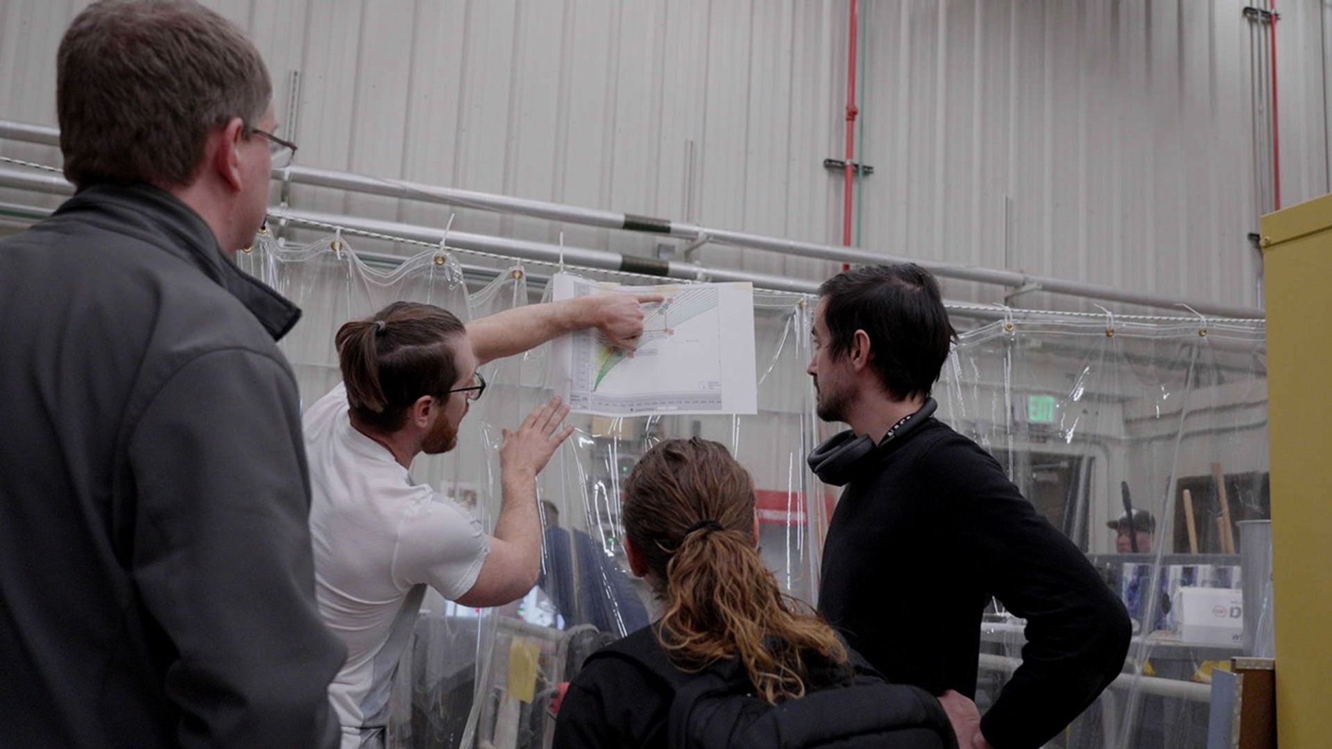 Patrick DeGrosse and fellow engineers at NASA’s Jet Propulsion Laboratory review data from a drop-test of a full-size footpad for a future Mars lander.