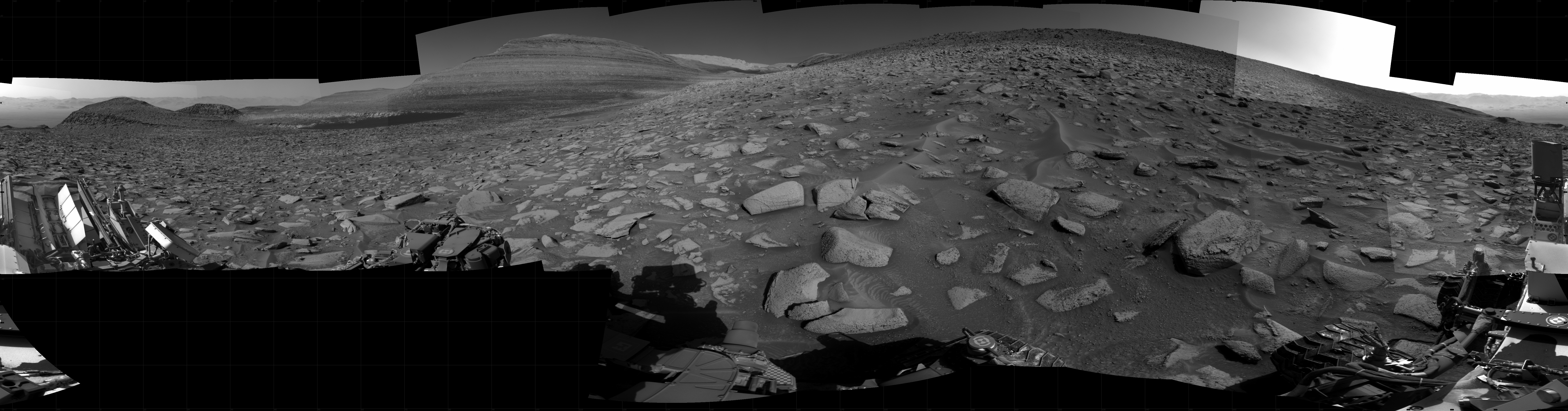 NASA's Mars rover Curiosity took 25 images in Gale Crater using its mast-mounted Right Navigation Camera (Navcam) to create this mosaic. The seam-corrected mosaic provides a 360-degree cylindrical projection panorama of the Martian surface centered at 157 degrees azimuth (measured clockwise from north). Curiosity took the images on August 07, 2023, Sol 3910 of the Mars Science Laboratory mission at drive 400, site number 103. The local mean solar time for the image exposures was 2 PM. Each Navcam image has a 45 degree field of view. CREDIT: NASA/JPL-Caltech