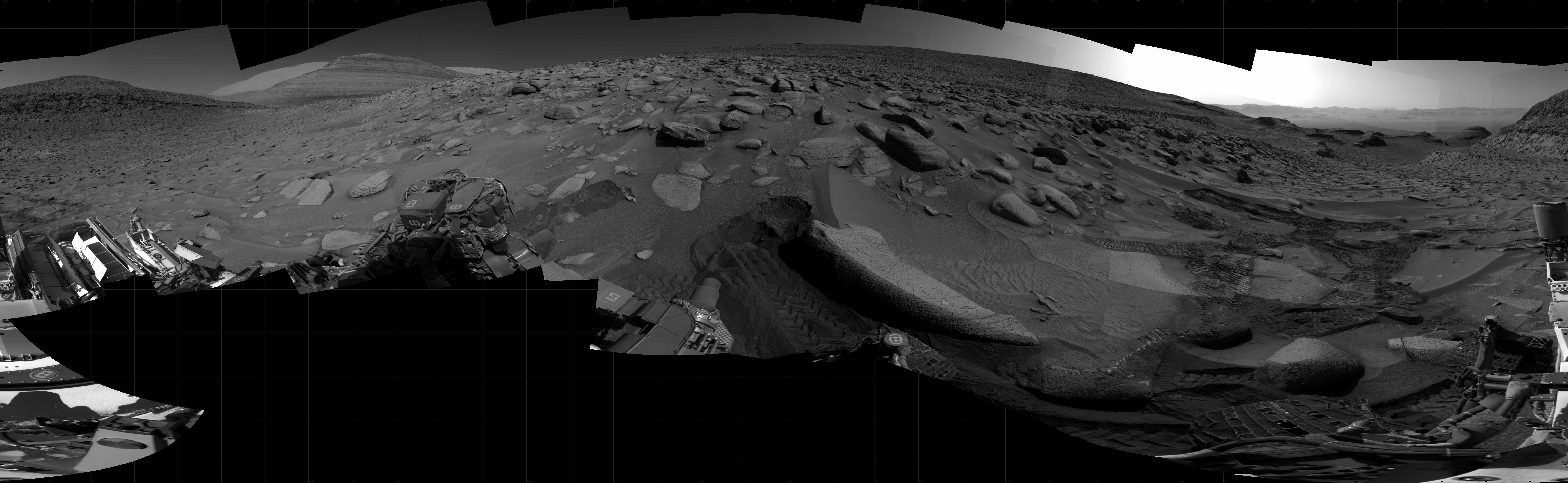 NASA's Mars rover Curiosity took 31 images in Gale Crater using its mast-mounted Right Navigation Camera (Navcam) to create this mosaic. The seam-corrected mosaic provides a 360-degree cylindrical projection panorama of the Martian surface centered at 209 degrees azimuth (measured clockwise from north). Curiosity took the images on June 07, 2023, Sol 3851 of the Mars Science Laboratory mission at drive 1402, site number 101. The local mean solar time for the image exposures was from 2 PM to 3 PM. Each Navcam image has a 45 degree field of view. CREDIT: NASA/JPL-Caltech