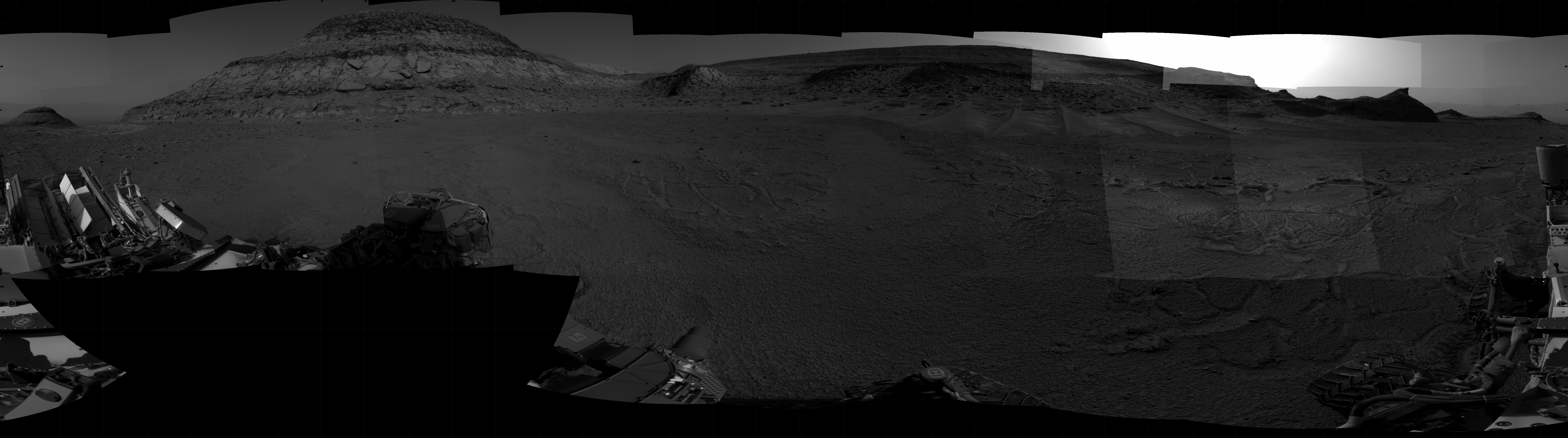 NASA's Mars rover Curiosity took 31 images in Gale Crater using its mast-mounted Right Navigation Camera (Navcam) to create this mosaic. The seam-corrected mosaic provides a 360-degree cylindrical projection panorama of the Martian surface centered at 186 degrees azimuth (measured clockwise from north). Curiosity took the images on February 01, 2023, Sol 3728 of the Mars Science Laboratory mission at drive 2276, site number 99. The local mean solar time for the image exposures was 4 PM. Each Navcam image has a 45 degree field of view. CREDIT: NASA/JPL-Caltech