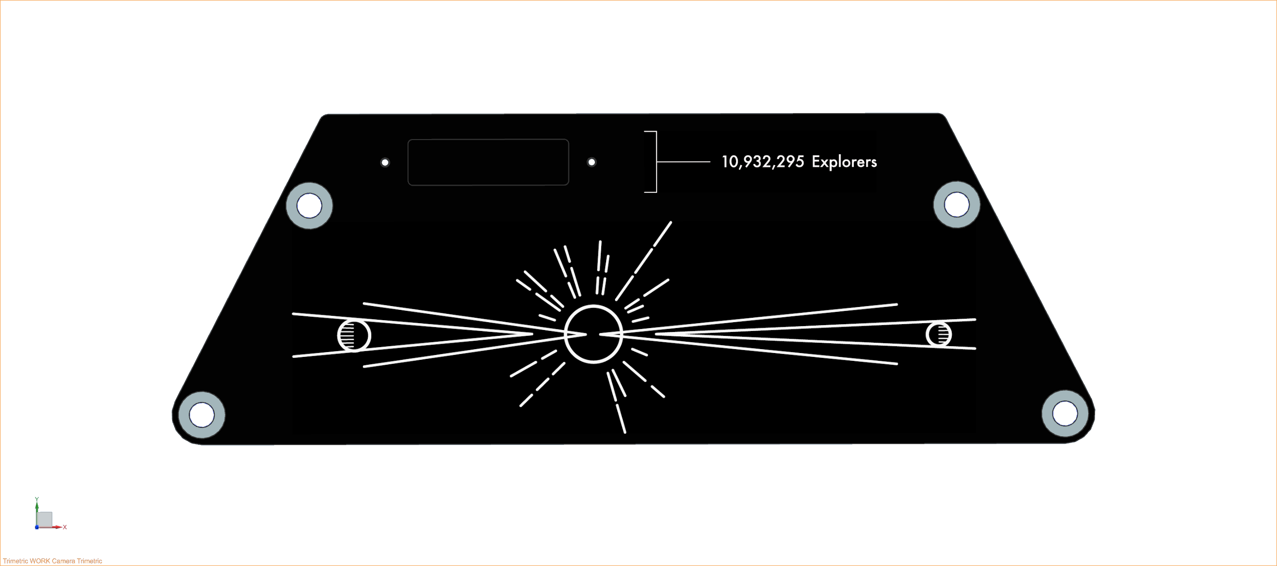 This artwork is etched on a metal plate attached to a crossbeam near the back of the Mars Perseverance rover. Three silicon chips containing 10.9 million names of Mars fans are mounted to the actual plate. In the center of the anodized plate, the Sun shines brightly, giving light to both Earth and Mars. The Sun’s rays feature some hidden Morse code, spelling out a message of unity for our global community: “Explore as One.”