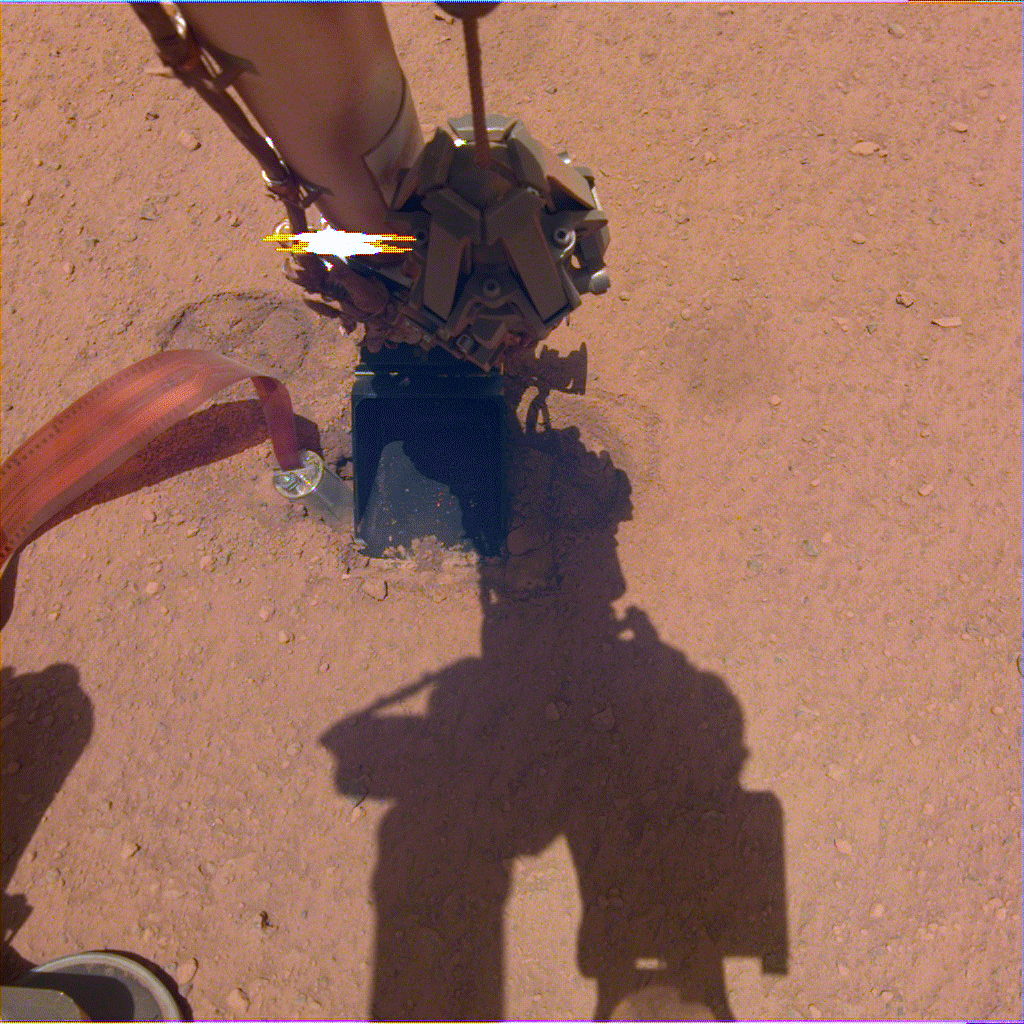 In this image from Oct. 26, 2019 — the 325th Martian day, or sol, of the mission — InSight's heat probe, or "mole," is seen after backing about halfway out of the hole it had burrowed.