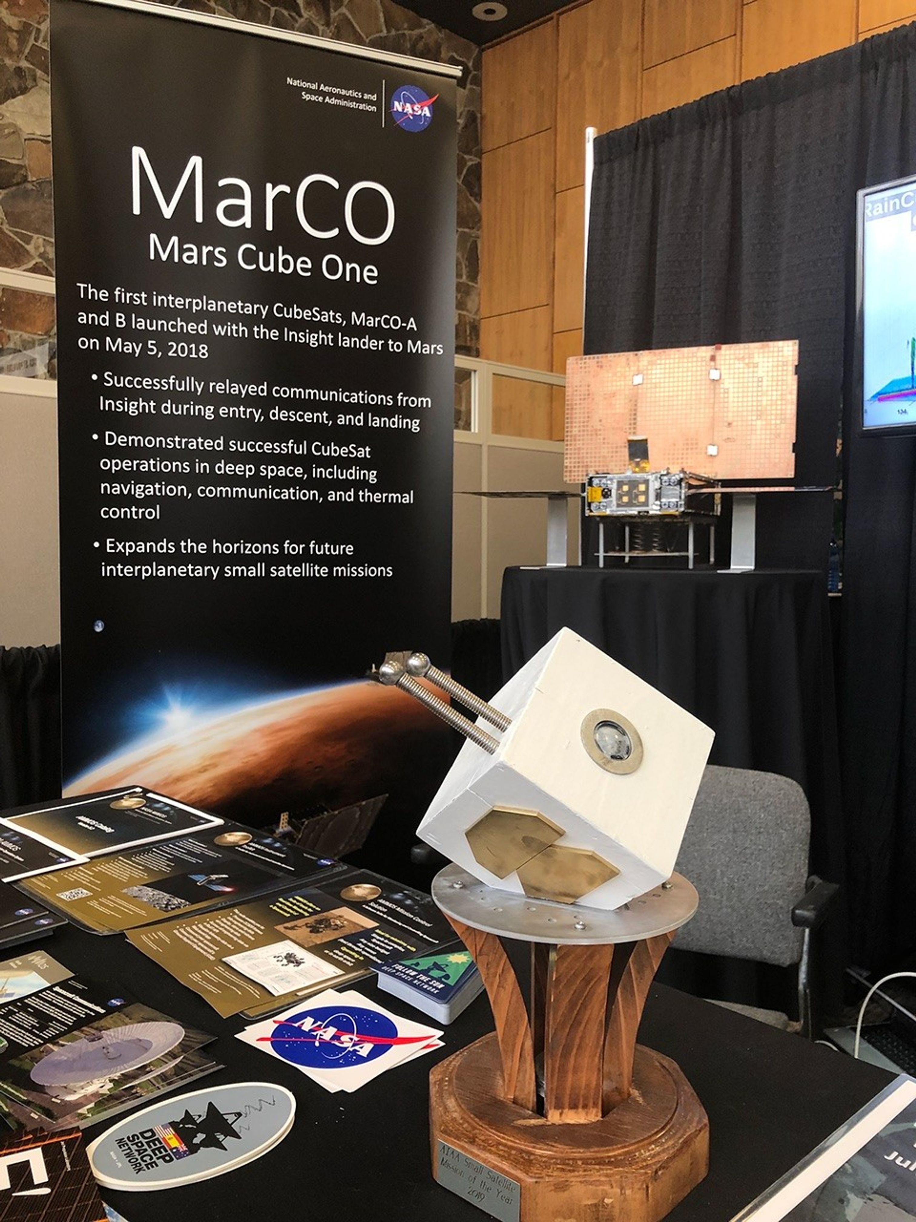 The 2019 Small Satellite Mission of the Year Award sitting at a MarCO exhibit space at the Small Satellite Conference in Logan, Utah.