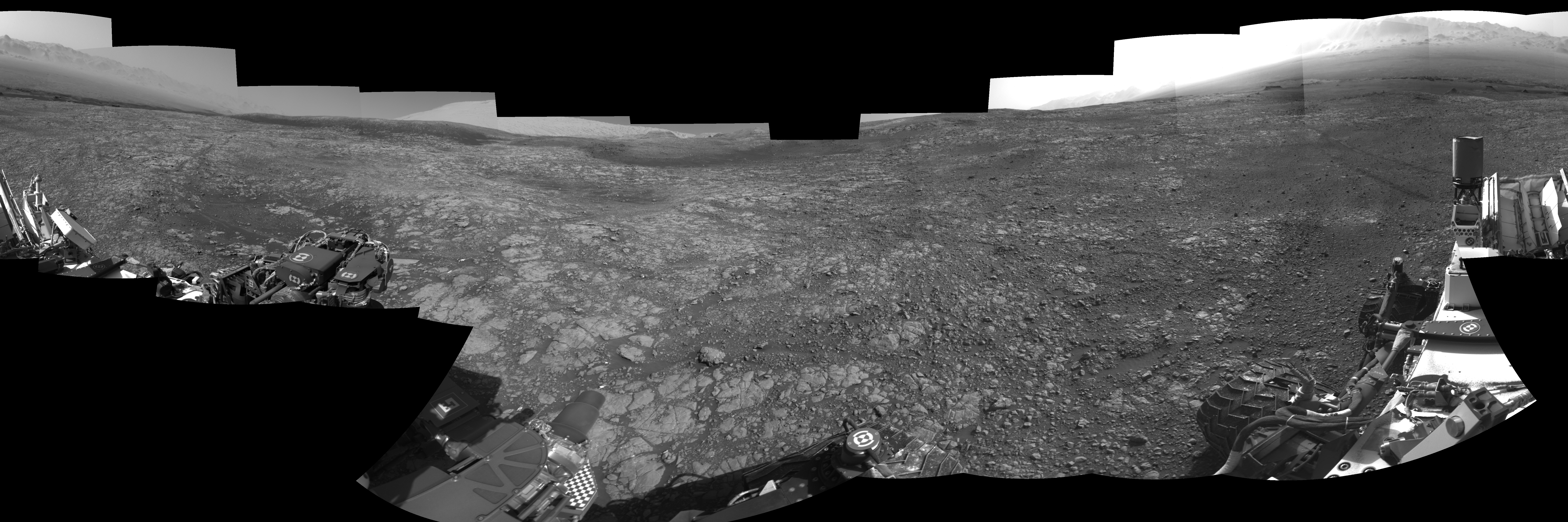 NASA's Mars rover Curiosity took 19 images in Gale Crater using its mast-mounted Right Navigation Camera (Navcam) to create this mosaic. The seam-corrected mosaic provides a 0-degree cylindrical-perspective projection panorama of the Martian surface suitable for stereo viewing, centered at 198 degrees azimuth (measured clockwise from north). This single-eye view must be combined with the partner left image to be viewed in stereo. Curiosity took the images on March 30, 2018, Sol 2007 of the Mars Science Laboratory mission at drive 714, site number 69. The local mean solar time for the image exposures was from 2 PM to 4 PM. Each Navcam image has a 45-degree field of view. CREDIT: NASA/JPL-Caltech