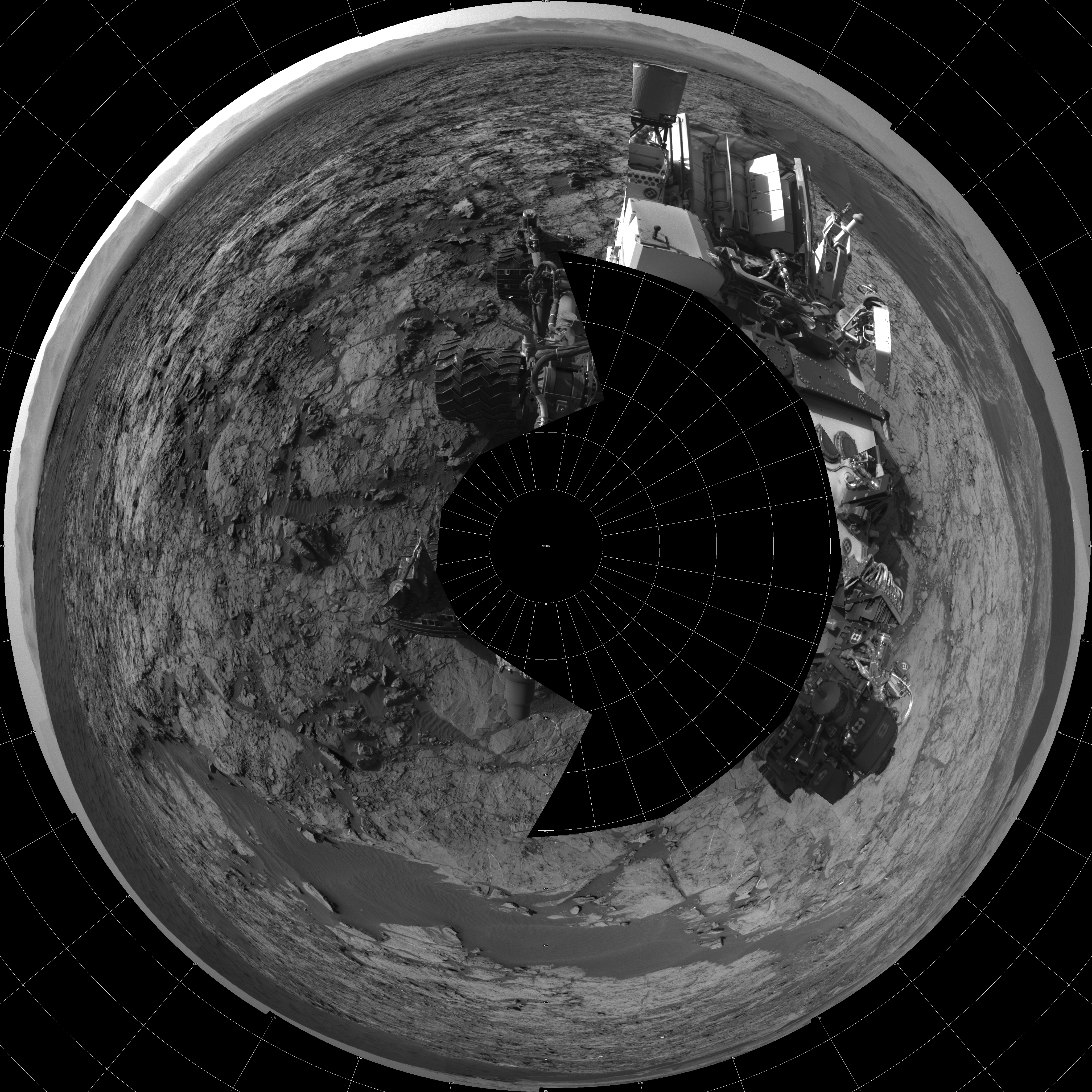 NASA's Mars rover Curiosity took 17 images in Gale Crater using its mast-mounted Left Navigation Camera (Navcam) to create this mosaic. The seam-corrected mosaic provides a polar stereographic projection panorama of the Martian surface with 0 degrees azimuth (measured clockwise from north) at the top of the image. Curiosity took the images on November 24, 2015, Sol 1173 of the Mars Science Laboratory mission at drive 874, site number 51. The local mean solar time for the image exposures was from 2 PM to 4 PM. Each Navcam image has a 45-degree field of view. CREDIT: NASA/JPL-Caltech