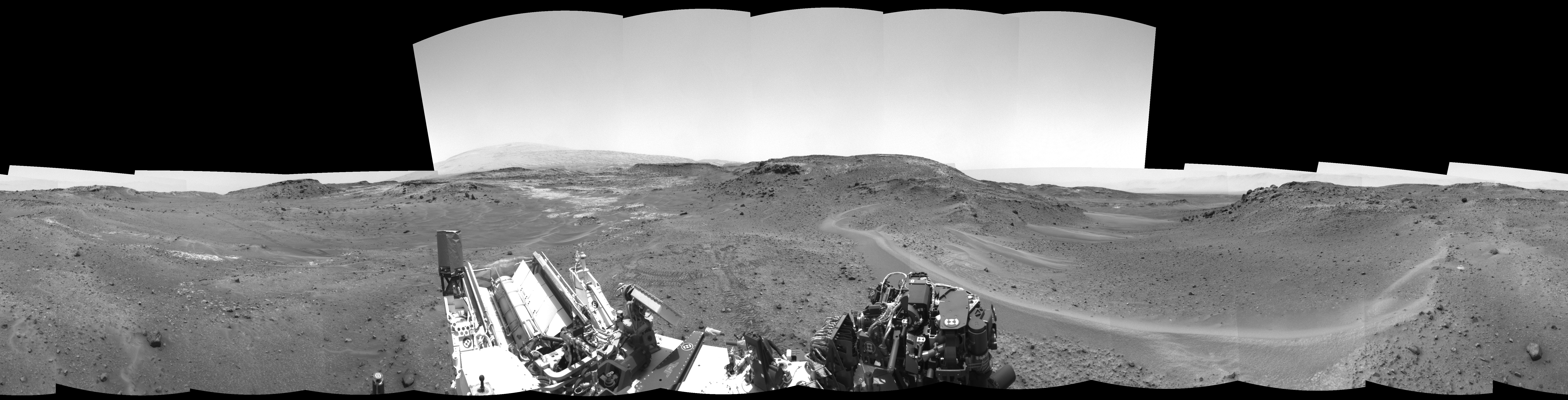 NASA's Mars rover Curiosity took 17 images in Gale Crater using its mast-mounted Left Navigation Camera (Navcam) to create this mosaic. The seam-corrected mosaic provides a 360-degree cylindrical-perspective projection panorama of the Martian surface suitable for stereo viewing, centered at 266 degrees azimuth (measured clockwise from north). This single-eye view must be combined with the partner right image to be viewed in stereo. Curiosity took the images on April 15, 2015, Sol 956 of the Mars Science Laboratory mission at drive 472, site number 46. The local mean solar time for the image exposures was 1 PM. Each Navcam image has a 45-degree field of view. CREDIT: NASA/JPL-Caltech