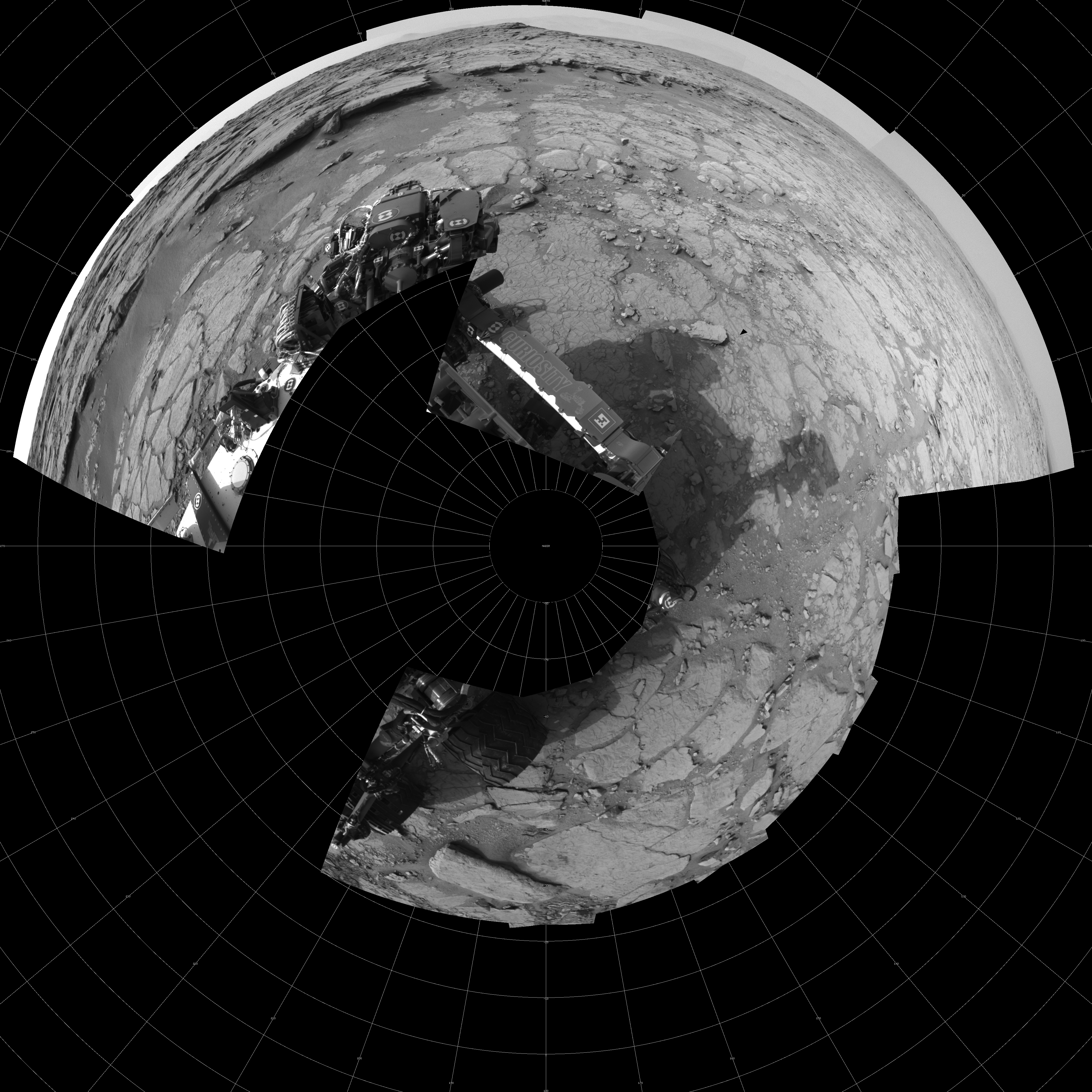 NASA's Mars rover Curiosity took 11 images in Gale Crater using its mast-mounted Left Navigation Camera (Navcam) to create this mosaic. The seam-corrected mosaic provides a polar stereographic projection panorama of the Martian surface with 0 degrees azimuth (measured clockwise from north) at the top of the image. Curiosity took the images on December 15, 2012, Sol 127 of the Mars Science Laboratory mission at drive 1576, site number 5. The local mean solar time for the image exposures was 3 PM. Each Navcam image has a 45-degree field of view. CREDIT: NASA/JPL-Caltech