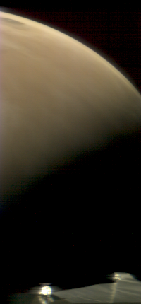 MAVEN selfie with Mars in the background. This is one of the individual images that made up the selfie, showing the magnetometer and Sun sensor at the end of the solar panel. Mars is seen in the background; the dark spot at the top of the image is the Olympus Mons volcano.