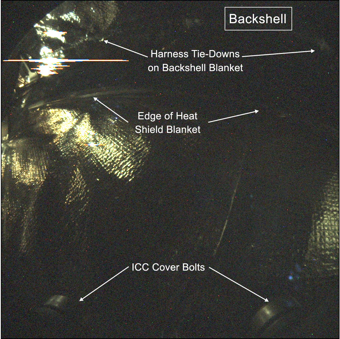 The annotations in this image call out discernable components in the backshell -- the heatshield blanket, harness tie-downs, and cover bolts for the ICC. The heat shield blanket provides thermal protection from the hot and cold temperature swings encountered during cruise, and the high heat that will occur during Mars atmospheric entry. The tie-downs are used to secure harnesses (or other objects) so they do not move around inside the aeroshell while in flight. The ICC cover bolts secure a protective transparent window to the camera during cruise and entry, descent and landing. The cover is opened after landing and is not visible during surface operations.