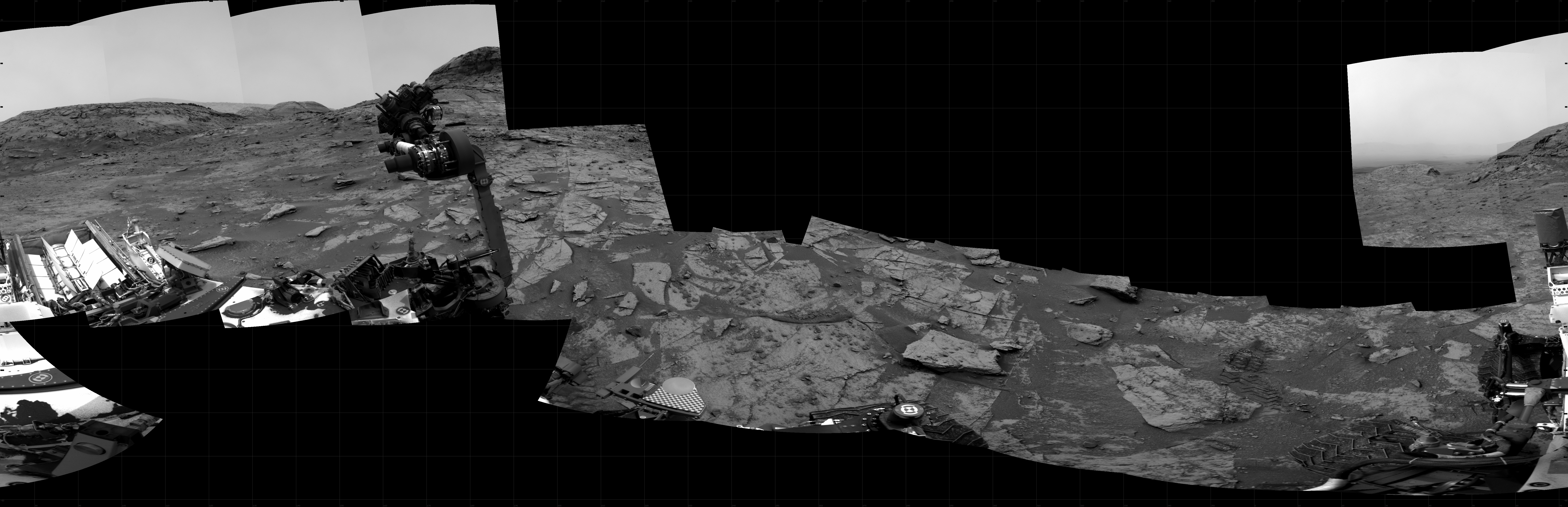 NASA's Mars rover Curiosity took 17 images in Gale Crater using its mast-mounted Right Navigation Camera (Navcam) to create this mosaic. The seam-corrected mosaic provides a 360-degree cylindrical projection panorama of the Martian surface centered at 252 degrees azimuth (measured clockwise from north). Curiosity took the images on January 09, 2022, Sol 3351 of the Mars Science Laboratory mission at drive 2002, site number 92. The local mean solar time for the image exposures was 1 PM. Each Navcam image has a 45 degree field of view. CREDIT: NASA/JPL-Caltech