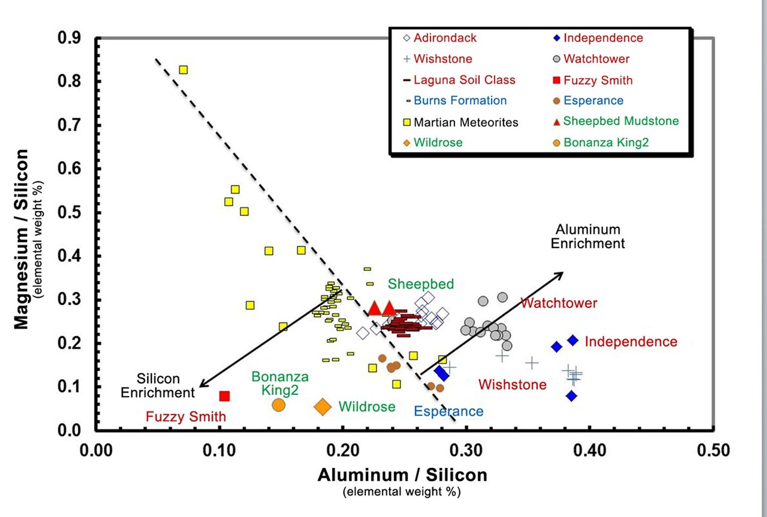 Data from the Alpha Particle X-ray Spectrometer (APXS) instrument on NASA's Mars rover Curiosity show an unusual enrichment of silicon in the rocks dubbed "Wildrose" and "Bonanza King," relative to other rocks studied at Gale Crater on Mars, where the rover landed. This same enrichment had been seen by earlier missions to Mars (labeled in red), and even in Mars meteorites (black). The Bonanza King rock is most similar to "Fuzzy Smith" in silicon abundance. Fuzzy Smith, studied by the rover Spirit at Gusev Crater, indicated a past aqueous environment.