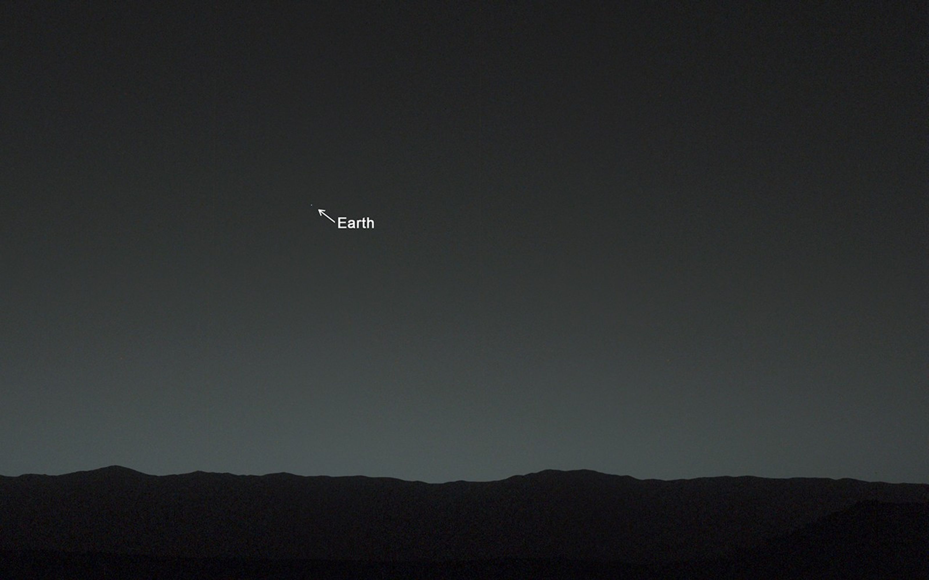 This view of the twilight sky and Martian horizon taken by NASA's Curiosity Mars rover includes Earth as the brightest point of light in the night sky. Earth is a little left of center in the image, and our moon is just below Earth. Two annotated versions of the image are also available.