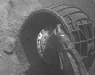 The two wide-angle views shown one after the other in this comparison come from Spirit's front hazard-avoidance camera, one taken before the resistance test and the other after the test. The most obvious change is in the position of shadows, a change unrelated to the wheel's movement during the drive. The shaded area gets smaller in the "after" image. The very small amount of wheel movement discernible -- and also indicated by telemetry from the rover -- is equivalent to about one full rotation of the drive motor at the wheel's gear ratio of about 1,500 motor rotations for each full wheel rotation.