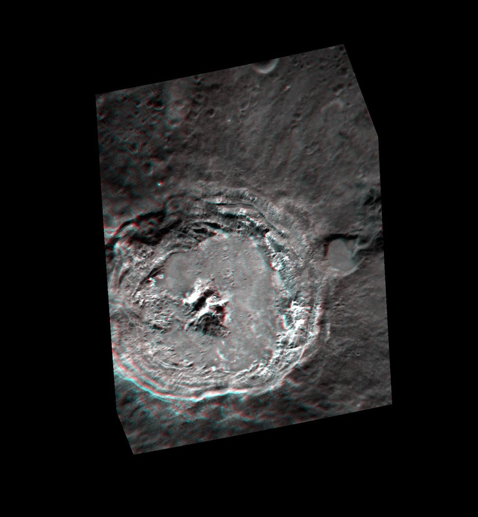Dust off those red-cyan 3D glasses again to see Kuiper crater in three dimensions! This anaglyph image was created from two separate images taken under slightly different viewing conditions. This images shows the young Kuiper crater, the impact melt covering its floor, its tall central peaks, and its slumping walls. North is to the left in this image.