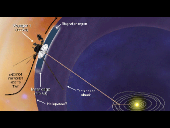 Voyager 1 crossed a shockwave known as the termination shock in 2004. At the termination shock, the solar wind slows down abruptly from supersonic speeds. The heliopause is the boundary between the bubble of charged particles around our sun -- known as the heliosphere -- and interstellar space. Its location is still a mystery.