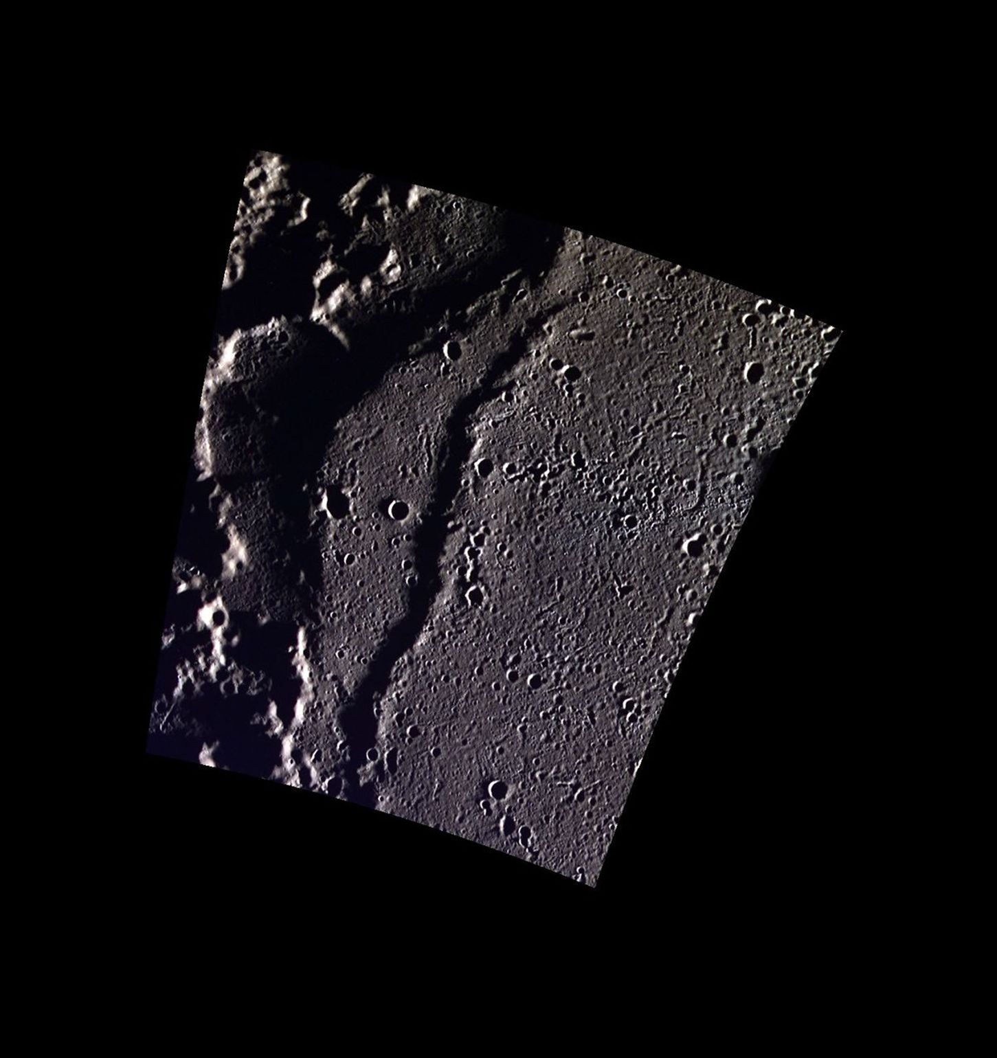 This view shows the edge of the Goethe Basin. The margins of the basin interior are marked by wrinkle ridges. Part of one such ridge is shown in this image. The scene also includes small secondary crater chains on the smooth plains that fill the basin, and the hummocky terrain outside of the basin.