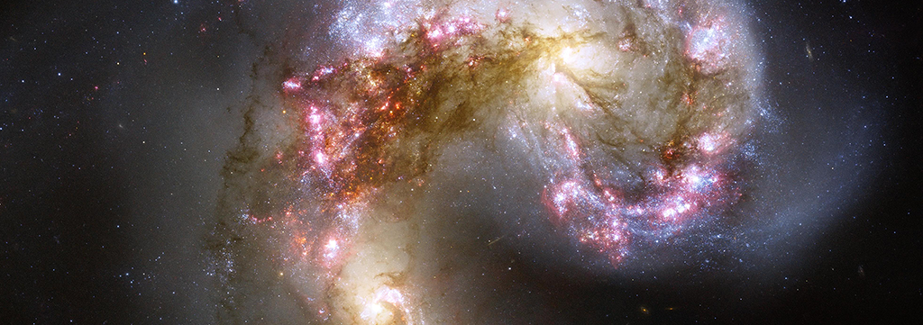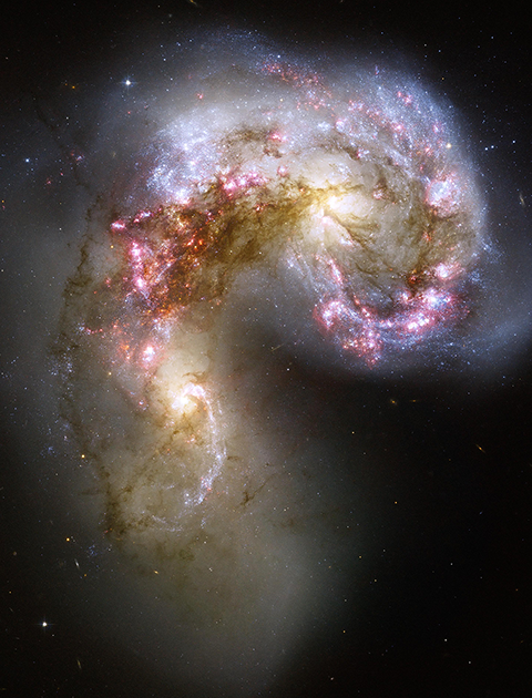The cosmic smashup has pulled dark dust into long strands stretching from one galaxy to the other. It has also compressed huge clouds of gas and dust, igniting a rash of new star formation within the galaxies. Clusters of young stars sparkle in blue, while pinkish star-forming nebulae are churning out even more stars. Astronomers estimate that billions of new stars will form as the two galaxies complete their collision and eventually merge into one galaxy.