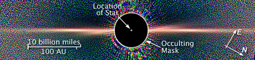 This Hubble Space Telescope view of Beta Pictoris clearly shows a primary dust disk and a much fainter secondary dust disk. The secondary disk extends at least 24 billion miles from the star and is tilted roughly 4 to 5 degrees from the primary disk. The secondary disk is...