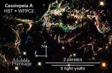 This stunning Hubble image of Cas A is allowing astronomers to study the supernova's remains with great clarity, showing for the first time that the debris is arranged into thousands of small, cooling knots of gas. This material eventually will be recycled into building new generations of stars and planets. Our own Sun and planets are constructed from the debris of supernovae that exploded billions of years ago.