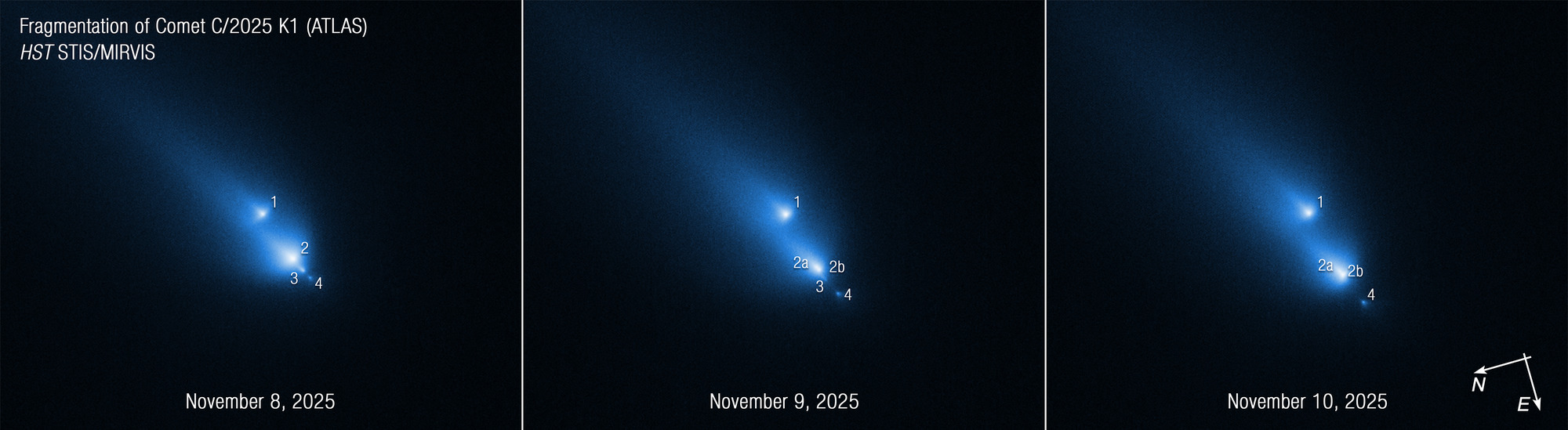 This annotated series of images from NASA’s Hubble Space Telescope of the fragmenting comet C/2025 K1 (ATLAS), or K1 for short, was taken over the course of three consecutive days: Nov. 8, 9, and 10, 2025. Captured by Hubble’s STIS (Space Telescope Imaging Spectrograph) instrument, the sequence shows the progressive disintegration of the comet over this brief period.