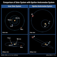 This is an artist's illustration that compares the solar system with the Upsilon Andromedae system. Astronomers have recently discovered that not all planets orbit the bright yellow-white star Upsilon Andromedae in the same plane, as the major planets in our solar system orbit the Sun. The orbits of two of the planets, c and d, are inclined by 30 degrees with respect to each other. Such a strange orientation has never before been seen in any other planetary system. This surprising finding will impact theories of how planetary systems form and evolve, say researchers. It suggests that some violent events can happen to disrupt planets' orbits after a planetary system forms. The discovery was made by joint observations with the Hubble Space Telescope, the Hobby-Eberly Telescope, and other ground-based telescopes.