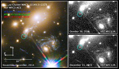 The science team includes: P. Kelly (UC Berkeley), S. Rodney (University of South Carolina), G. Brammer (STScI), L. Strolger (STScI/WKU), R. Foley (University of Illinois at Urbana-Champaign), T. Treu (UCLA), A. Zitrin (Caltech), A. Filippenko (UC Berkeley), S. Jha (Rutgers University), A. Riess (JHU/STScI), J. Hjorth (Dark Cosmology Centre, Copenhagen), K. Schmidt (UC Santa Barbara), O. Graur (NYU/AMNH), M. Bradac (UC Davis), B. Weiner (Steward Observatory/UA), A. von der Linden (Dark Cosmology Centre, Copenhagen/KIPAC, Stanford), C. McCully (LCOGT/UC Santa Barbara), A. Molino (IAA-CSIC), J. Selsing (Dark Cosmology Centre, Copenhagen), M. Nonino (IAG/USP), and D. Coe (STScI).The color image is created from data from the following HST proposals:13459 : T. Treu (UCLA) et al. and the GLASS team, 13504 J. Lotz (STScI) et al. and the Frontier Fields team;
