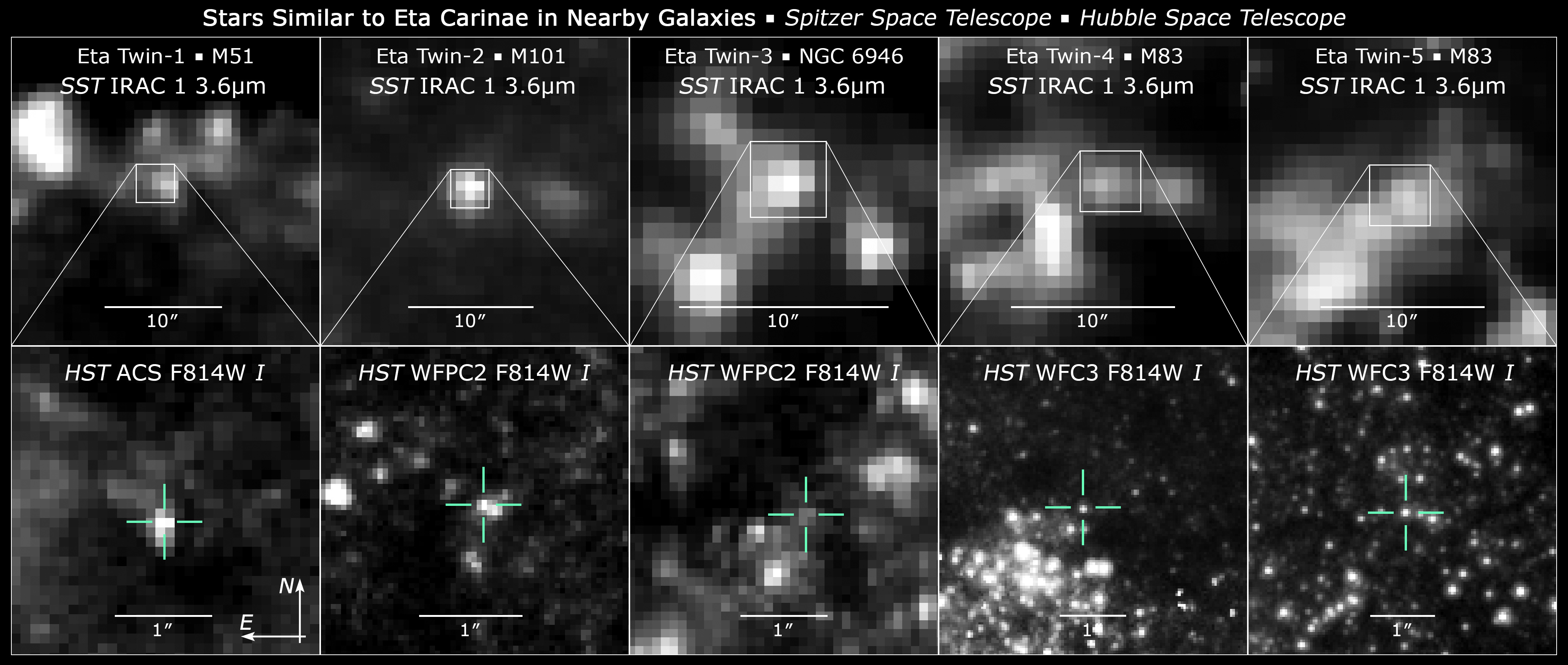 Researchers found likely Eta twins in four galaxies by comparing the infrared and optical brightness of each candidate source. Infrared images from NASA's Spitzer Space Telescope revealed the presence of warm dust surrounding the stars. Comparing this information with the...