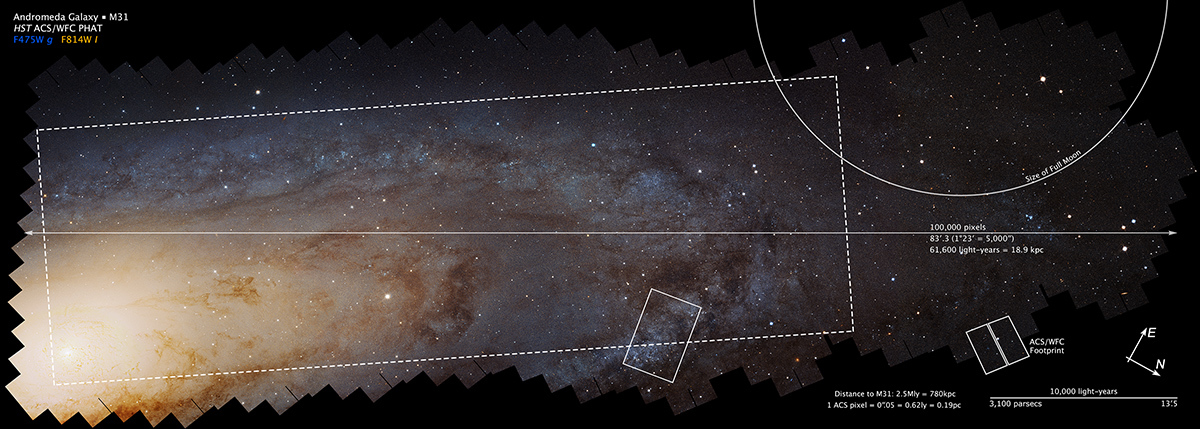 The Hubble Space Telescope M31 PHAT mosaic image is shown in context with a ground-based image of galaxy M31. The background image, taken by Robert Gendler, was made by compositing M31 data from a 12.5-inch Ritchey-Chretien telescope with M31 data from the Digitized Sky Survey.