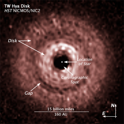 This illustration shows that the TW Hydrae protoplanetary disk is much wider than the size of our solar system. In fact, the gap in the TW Hydrae disk produced by a suspected planet resides 7.5 billion miles from the star. At this distance, the putative planet would orbit far...