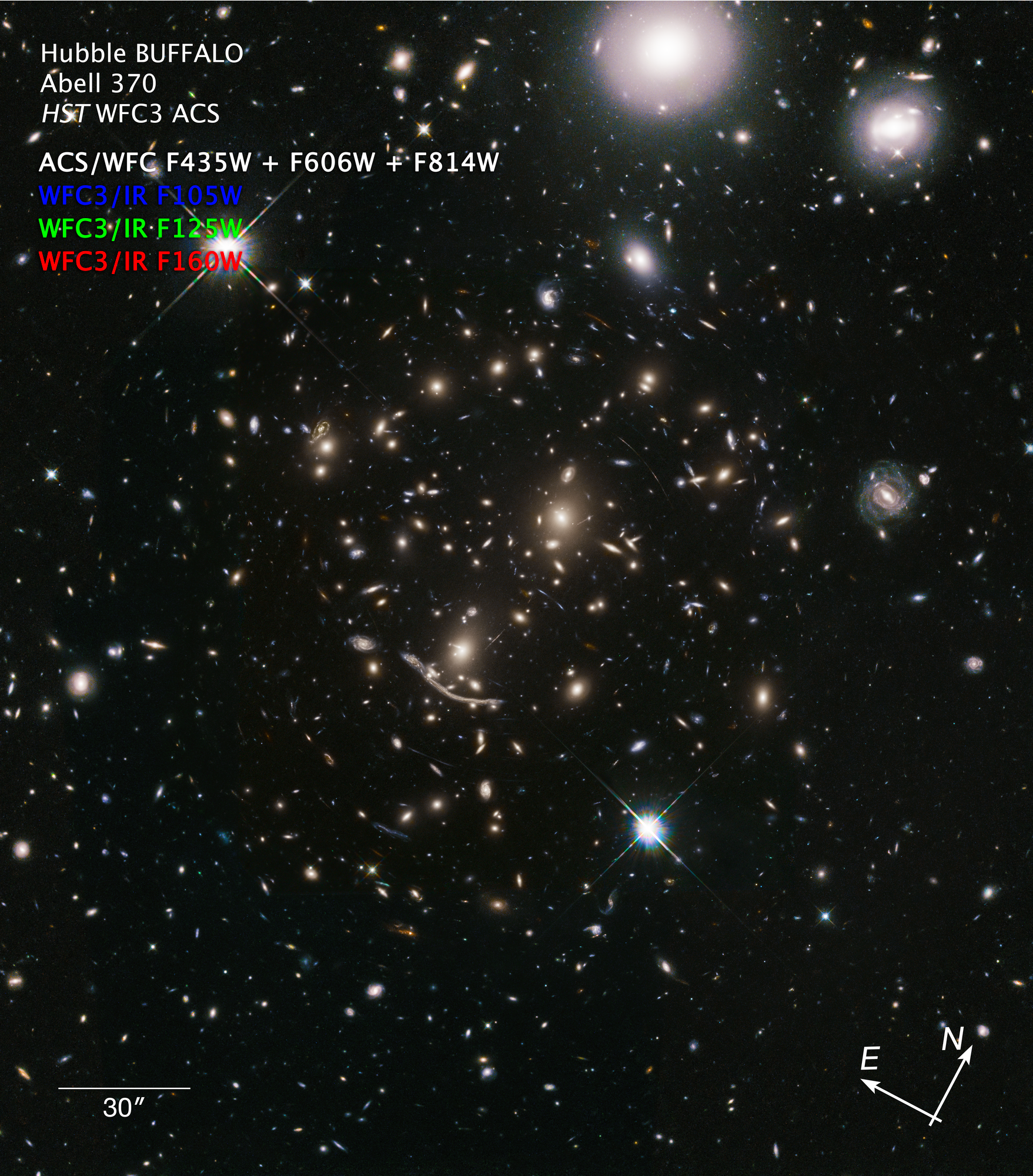Science Team: The astronomers who planned the observations and analyzed the data. "PI" refers to the Principal Investigator.Abell 370 is part of the BUFFALO and Frontier Fields Programs. These data are from the HST proposals 15117 (PI: C. Steinhardt, Niels Bohr Institute, University of Copenhagen), 11108 (PI: E. Hu, University of Hawaii), 11507 (PI: K. Noll, GSFC), 11591 (PI: J.-P. Kneib, Laboratoire d'Astrophysique de Marseille), 13459 (PI: T. Treu, UCLA), 13790 (PI: S. Rodney, JHU), 14038 (PI: J. Lotz, STScI), and 14216 (R. Kirshner, Harvard University). - InstrumentInstrumentThe science instrument used to produce the data.ACS/WFC; WFC3/IR