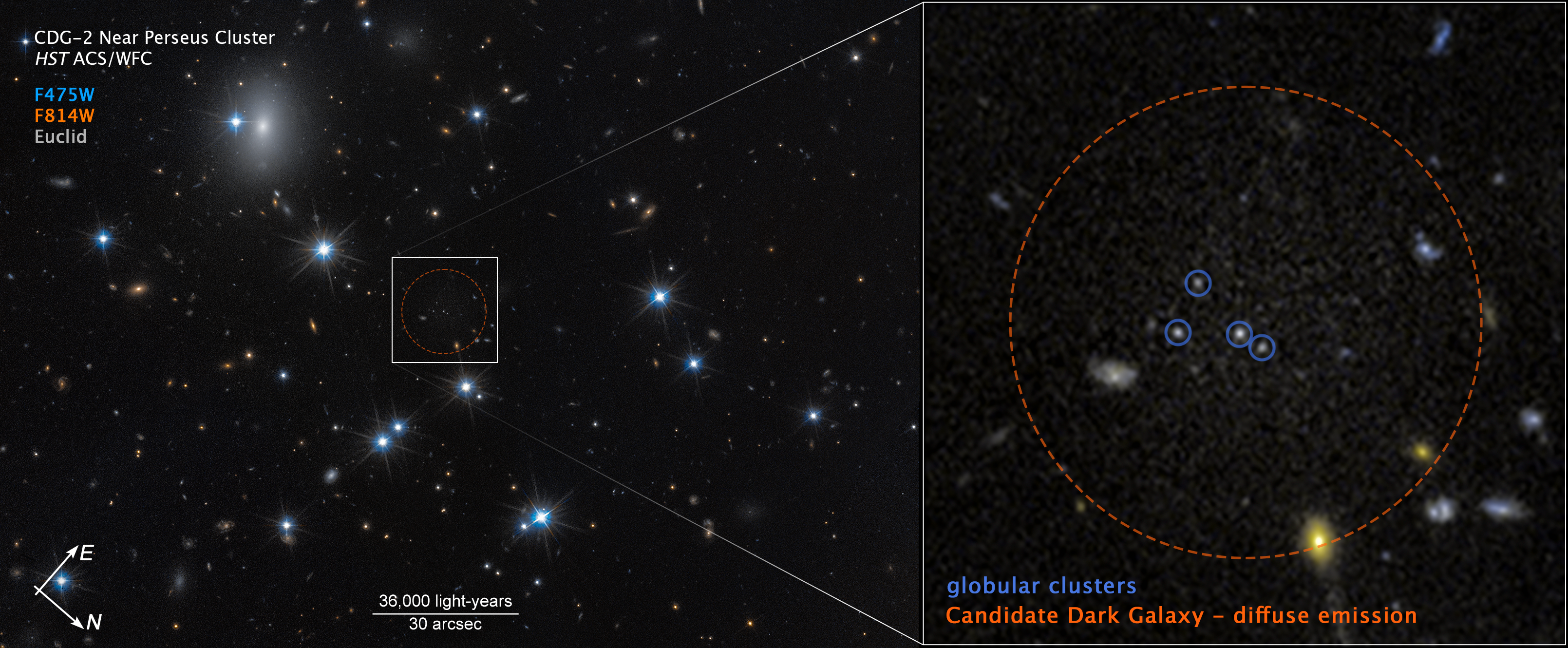 Image labeled “CDG 2 near Perseus Cluster, HST ACS WFC”. At left, a field of space with a dozen white foreground stars and a number of small, yellow background galaxies. An unremarkable area at center is outlined with a dashed red circle surrounded by a white box. Lines extend from the box to a pullout at right containing faint, grainy white light surrounded by a red circle labeled “Candidate dark galaxy – diffuse emission.” Four white dots are circled in blue and labeled globular clusters. Compass arrows at lower left show east pointing to 1 o’clock and north pointing to 4 o’clock. A scale bar is labeled 36,000 light-years and 30 arcseconds. It extends about one-eighth of the way across the image. A color key shows F475W in blue, F814W in orange, and Euclid in gray.