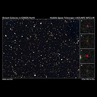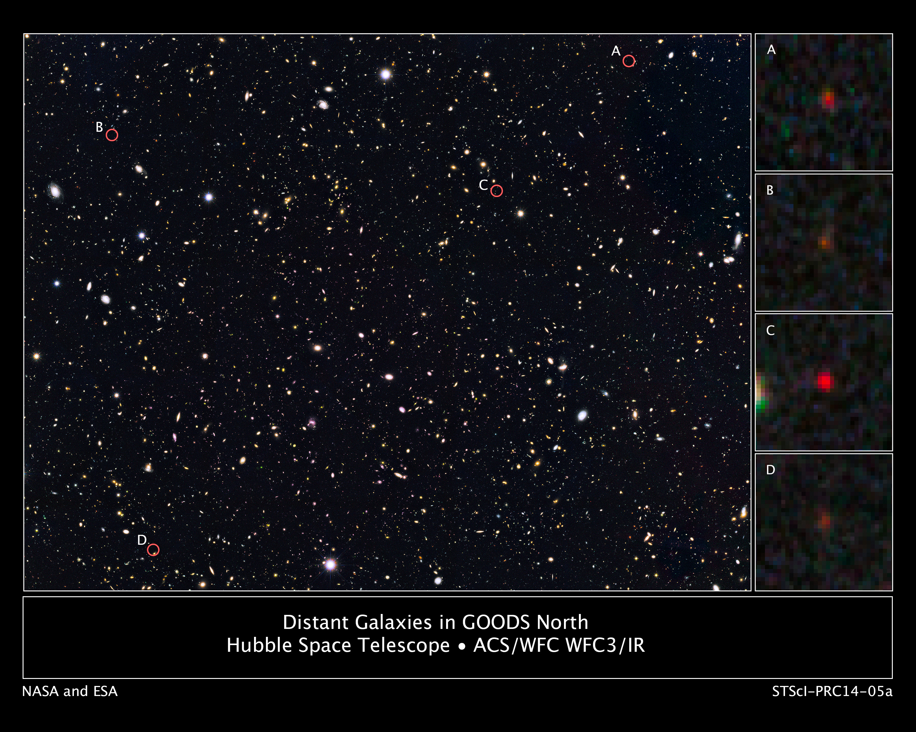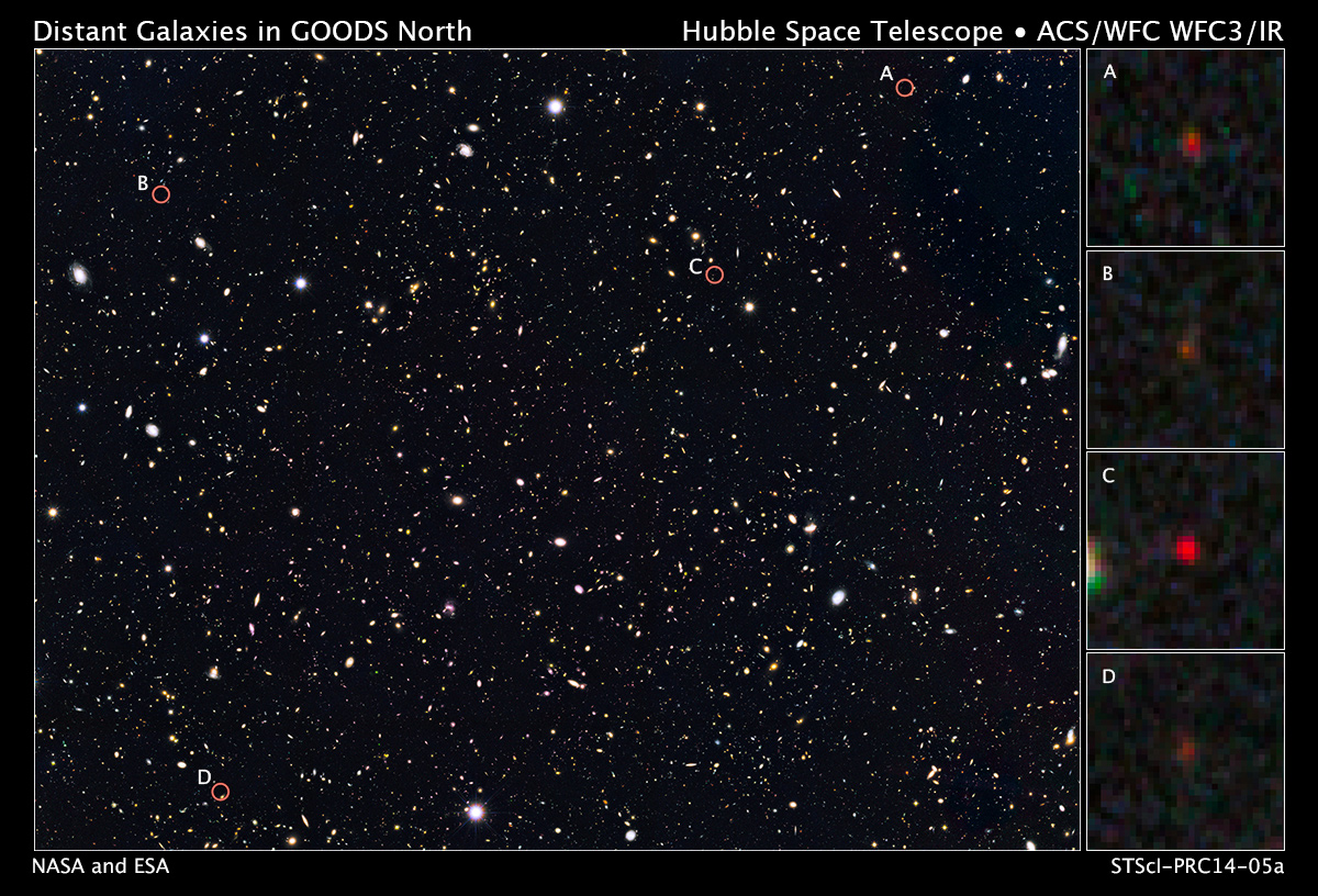 This is a portion of a deep-sky Hubble Space Telescope survey called GOODS North (Great Observatories Origins Deep Survey). The view is a composite of images taken in visible and near-infrared light. Researchers have circled four unusually red objects that appear as they existed just 500 million years after the big bang. They appear red because their light has been stretched to longer infrared wavelengths by the expansion of the universe. These extremely compact and bright galaxies present a puzzle to researchers because they are much more luminous than anything previously seen at such an early epoch. The young galaxies are bright because they are forming stars at a much faster rate than for other galaxies found at such early times.
