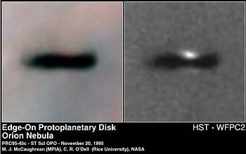 Resembling an interstellar Frisbee, this is a disk of dust seen edge-on around a newborn star in the Orion nebula, located 1,500 light-years away. Because the disk is edge-on, the star is largely hidden inside, in this striking Hubble Space Telescope picture. The disk may be an embryonic planetary system in the making. Our solar system probably formed out of just such a disk 4.5 billion years ago. At 17 times the diameter of our own solar system, this disk is the largest of several recently discovered in the Orion nebula.